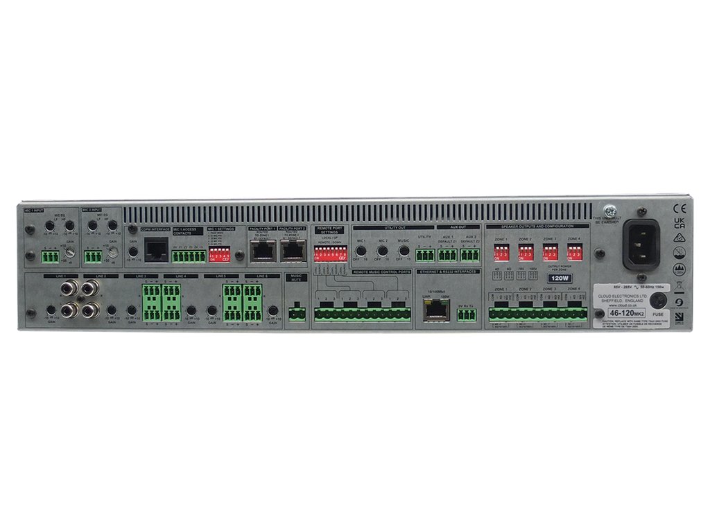 4-zónový mixážní zesilovač, 6 linkových vstupů, 2 mikrofonní vstupy, fantomové napájení, 4 x 120W (4Ohm, 70V, @100V), další volitelné příslušenství - vzdálené ovládání (RSL-6, LM-2), připojení pro vyvolávací mikrofon (PM1, PM4) nebo pro místní hlášení (PM4-SA, PM8-SA).Doplňkové parametry