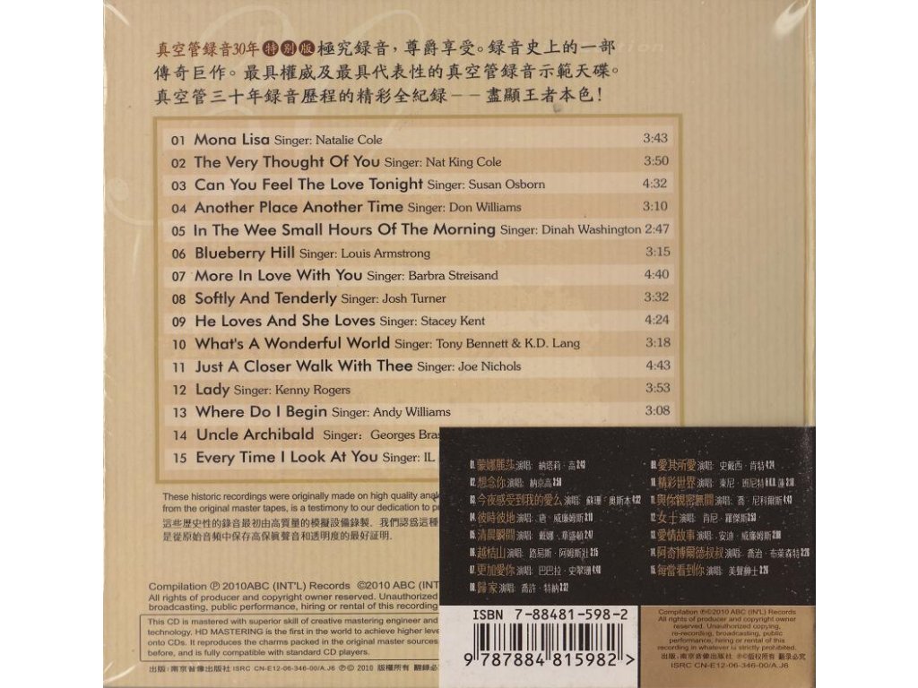 SAMPLER HD-Mastering CD - AAD / Limitovaná edice / Made in Germany HD-104 Made in Germany Label : ABC Int. Records 01 Mona Lisa - Singer : Natalie Cole 03:43 02 The Very Thought Of You - Singer:Nat King Cole 03:50 03 Can You Feel The Love Tonight - Singer:Susan Osborn 04:32 04 Another Place Another Time - Singer:Don Williams 03:10 05 In The Wee Small Hours Of The Morning - Singer:Dinah Washington 06 Blueberry Hill - Singer:Louis Armstrong 03:15 07 More In Love With You - Singer:Barbra Streisand 04:40 08 Softly And Tenderly - Singer:Josh Turner 03:32 09 He Loves And She Loves - Singer:Stacey Kent 04:24 10 What’s A Wonderful World - Singer:Tony Bennett & K.D. Lang 03:18 11 Just A Closer Walk With Thee - Singer:Joe Nichols 04:43 12 Lady - Singer:Kenny Rogers 03:53 13 Where Do I Begin - Singer:Andy Williams 03:08 14 Uncle Archibald - Singer:Georges Brassens 03:26 15 Every Time I Look At You - Singer:IL Divo 04:00Doplňkové parametry