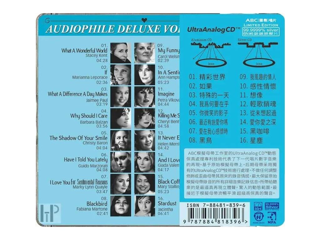 Novinka 2024 Album Title:Audiophile Deluxe Voices Item No:HDS-319 Artists :Various Artists Genre:Jazz vocal Company:ABC (Int'l)Records Audiophile Deluxe Voices - 6N 99,9999% Pure Silver Grand Master 01 What A Wonderful World - Stacey Kent 04:29 02 If - Marianna Leporace 02:37 03 What A Difference A Day Makes - Jaimee Paul 03:18 04 Why Should I Care - Barbara Balzan 03:58 05 The Shadow of Your Smile - Christy Baron 04:07 06 Have I Told You Lately - Guido Marzorati 04:12 07 (I Love You) For Sentimental Reasons - Marky Lynn Quayle 03:47 08 Blackbird - Fabiana Martone 02:42 09 My Funny Valentine - Carol Welsman 02:39 10 In a Sentimental Mood - Ann Hampton Callaway 05:22 11 Imagine - Petra Vlkova 04:42 12 Killing Me Softly With His Song - Cheryl Bentyne 04:59 13 It Never Entered My Mind - Helen Merrill 04:42 14 And I Love You So - Giada Valenti 04:15 15 Black Coffee - Mary Stallings 05:22 16 Stardust - Jacintha 06:40Doplňkové parametry