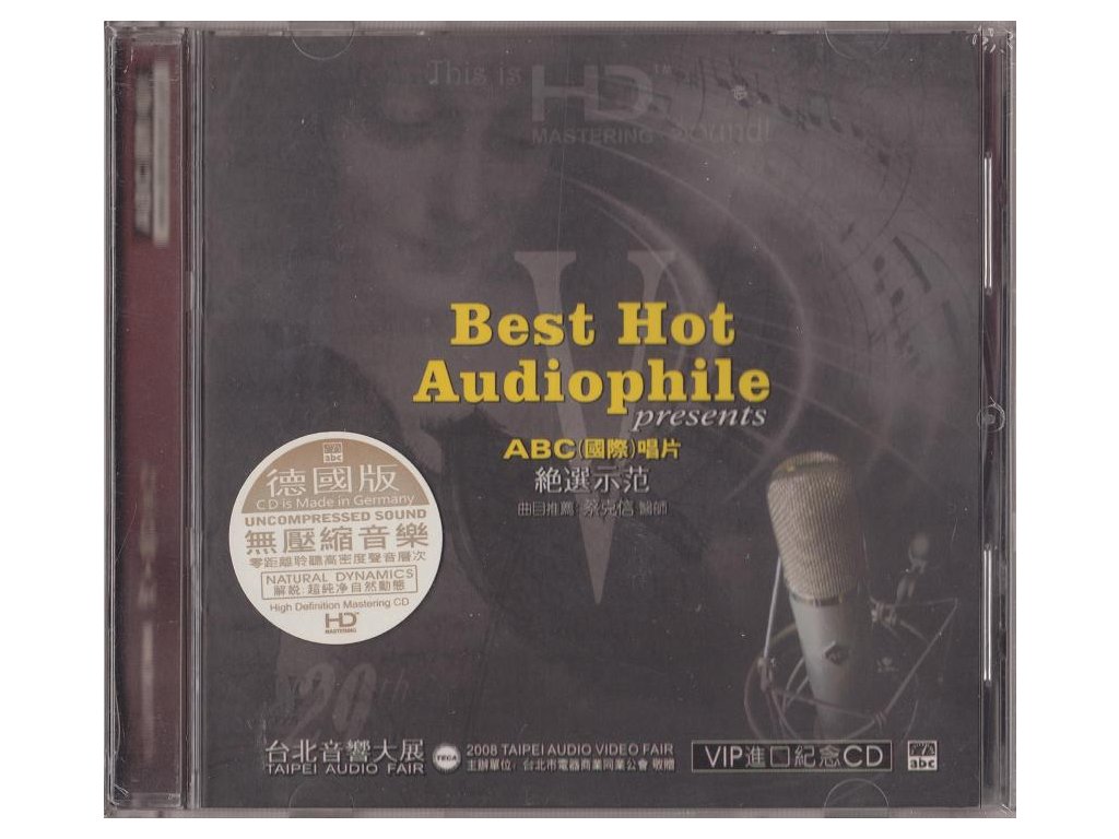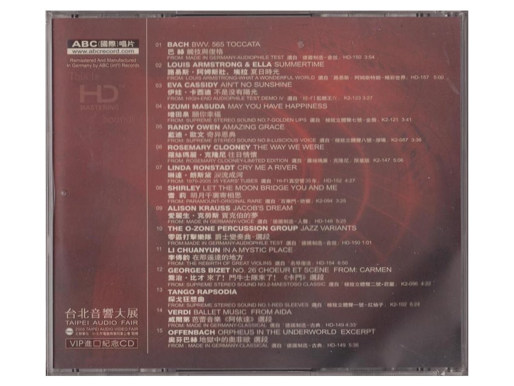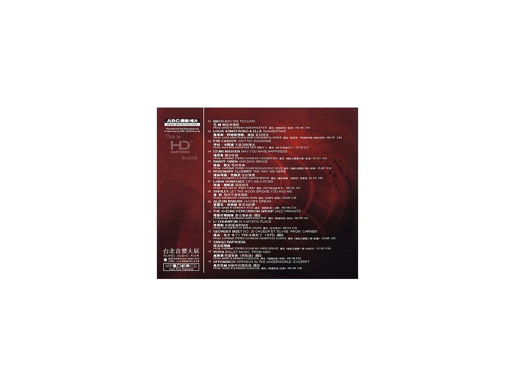 SAMPLER HD-Mastering CD - AAD / Limitovaná edice / 2008 / Natural Dynamics / Made in Germany HD-002 Label : ABC Int. Records 01. BWV. 565 Toccata From: Made in Germany - Audiophile Test - Composer: Bach 03:54 02.Summertime From: Louis Armstrong - What A Wonderful World - Singer: Louis Armstrong & Ella 05:00 03.Ain`t No Sunshine From: High-End Audiophile Test Demo Ⅳ - Singer: Eva Cassidy 03:27 04.May You Have Happiness From: Supreme Stereo Sound No.7 - Golden Lips - Singer: Jzumi Masuda 03:41 05.Amazing Grace From: Supreme Stereo Sound No.8 - Luscious Voice - Singer: Randy Owen 03:36 06.The Way We Were From:Rosemary Clooney - Limited Edition - Singer: Rosemary Clooney 05:06 07.Cry Me A River From:1970-2005 35 Years’ Tubes - Singer: Linda Ronstadt 04:27 08.Let The Moon Bridge You And Me From:Paramount-Original Rare - Singer: Shirley 03:25 09.Jacob’s Dream From: Made in Germany - Voice - Singer: Alison Krauss 05:25 10.Jazz Variants - Performer: The O-zone Percussion Group 01:01 11.In a Mystic Place From:The Rebirth of Great Violins - Performer: Li Chuanyun 06:50 12.No. 26 Choeur et Scène From : Carmen - Composer: Georges Bizet 04:22 13.Tango Rapsodia From : Supreme Stereo Sound No.1 Red Sleeves 06:24 14.Ballet Music From Aida : Made in Germany - Classical - Composer: Verdi 04:33 15.Orpheus in the Underworld (excerpt) - Composer: Offenbach 05:36Doplňkové parametry