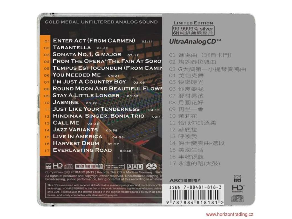 AAD / HD Mastering / Limitovaná edice / 6N 99.9999% Silver Ultra Analog CD Demo-017 Genre:Hi-Fi Music Company:ABC (Int'l)Records 01. Enter Act (From Carmen) - Composer: Bizet Conductor:René Leibowitz Performer: Orchestre Symphonique De Paris 02:11 02.Tarantella - Composer: Sarasate Conductor:Paul Freeman Performer:London Philharmonic Orchestra 04:42 03. Sonata No.1, G Major Composer: Rossini - Conductor:Neville Marriner Performer: Academy of St Martin in the Fields 07:12 04.From The Opera“The Fair At Sorotchinsk” - Composer:Mussorgsky Performer: Janos Starker 02:05 05.Tempus Est Iocundum (From Camina Burana) - Composer: Carl Orff Performer:Chicago Symphony Orchestra 02:31 06.You Needed Me - Singer: Dana Winner 04:01 07.I’m Just A Country Boy - Singer: Don Williams 03:05 08.Round Moon And Beautiful Flowers - Singer: Zhangyu 05:09 09.Stay A Little Longer - Singer: A Ming 03:32 10.Jasmine - Singer: Sela 03:26 11.Just Like Your Tenderness - Singer: Perry Shi 04:15 12.Hindinaa - Singer: Bonia Trio 02:17 13.Call Me - Singer: Hans Theessink 03:33 14. Jazz Variants - Performer: The O-zone Percussion Group 00:59 15.Live In America - Performer: Paco De Lucia 04:58 16. Harvest Drum Conductor: Peng Xiuwen - Performer: China Broadcasting Chinese Orchestra 05:57 17.Everlasting Road - Performer: Seattle Kokon Taiko 03:48Doplňkové parametry