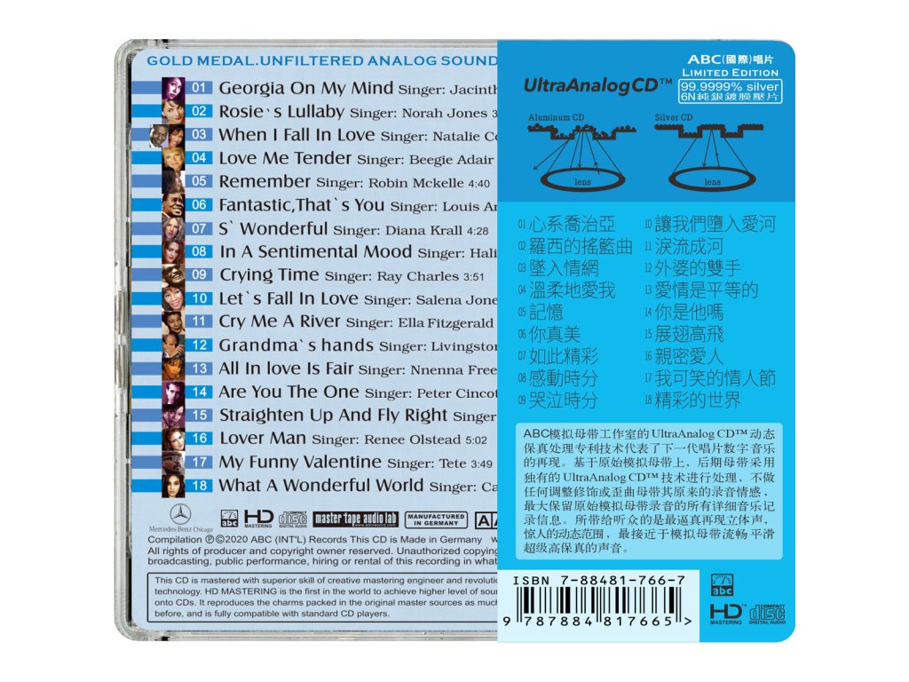 Album Title:Blues Voice Item No:HDS-214 Artists :Various Artists Genre:Western Classic Songs Company:ABC (Int'l)Records 6N - 99.9999% Silver UltraAnalog CD 01 Georgia on My Mind - Singer: Jacintha 05:15 02 Rosie's Lullaby Singer: Norah Jones - Singer:Jacintha 03:53 03 When I Fall In Love - Singer: Natalie Cole & Nat King Cole 04:09 04 Love Me Tender - Singer: Beegie Adair 01:15 05 Remember - Singer: Robin Mckelle 04:40 06 Fantastic,That's You - Singer: Louis Armstrong 02:54 07 S’Wonderful - Singer: Diana Krall 04:28 08 In A Sentimental Mood - Singer: Halie Loren 03:38 09 Crying Time - Singer: Ray Charles 03:51 10 Let's Fall In Love - Singer: Salena Jones 03:28 11 Cry Me A River - Singer: Ella Fitzgerald 04:15 12 Grandma’s Hands - Singer: Livingston Taylor 01:40 13 All In love Is Fair - Singer: Nnenna Freelon 06:51 14 Are you The One - Singer: Peter Cincotti 03:57 15 Straighten Up And Fly Right - Singer: Nnenna Freelon 03:23 16 Lover Man - Singer: Renee Olstead 05:02 17 My Funny Valentine - Singer: Tete 03:49 18 What A Wonderful World - Singer: Camelia Jordana 03:31Doplňkové parametry