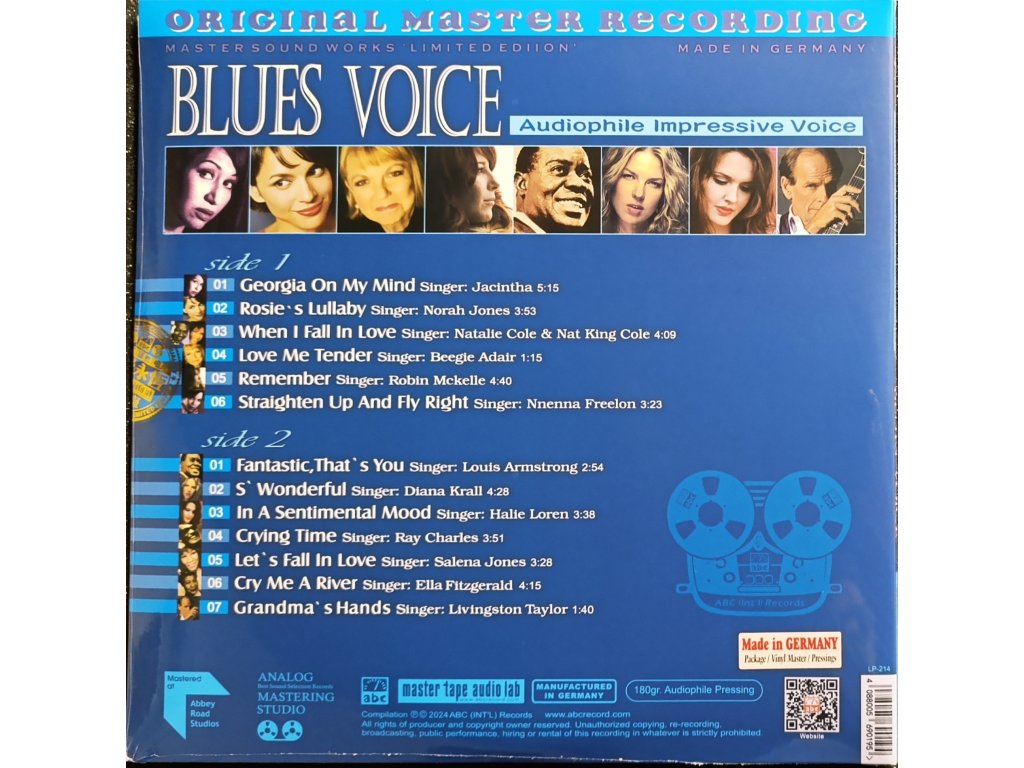 Half Speed Analog Mastering LP ABC Records - Blues Voice Label : ABC Int. Records Manufactured in Germany Limited Edition ABC Referenční výběrový LP sampler - Best OF ABC Record / Half Speed Analog Mastering LP/ Natural Dynamics / 180g / DMM / Mastered at Abbey Road Studios / 33RPM / Side 1: 01 Georgia on My Mind - Singer: Jacintha 05:15 02 Rosie's Lullaby Singer: Norah Jones - Singer:Jacintha 03:53 03 When I Fall In Love - Singer: Natalie Cole & Nat King Cole 04:09 04 Love Me Tender - Singer: Beegie Adair 01:15 05 Remember - Singer: Robin Mckelle 04:40 06 Straighten Up And Fly Right - Nnenna Freelom 03:23 Side 2: 01 Fantastic,That's You - Singer: Louis Armstrong 02:54 02 S’Wonderful - Singer: Diana Krall 04:28 03 In A Sentimental Mood - Singer: Halie Loren 03:38 04 Crying Time - Singer: Ray Charles 03:51 05 Let's Fall In Love - Singer: Salena Jones 03:28 06 Cry Me A River - Singer: Ella Fitzgerald 04:15 07 Grandma’s Hands - Singer: Livingston Taylor 01:40Doplňkové parametry