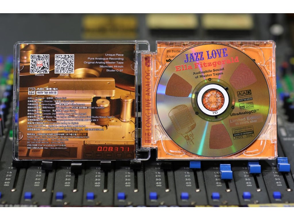 Referenční CD / HD Mastering / Natural Dynamics / Made in Germany/ Limited edition / 6N 99,9999% Silver / AAD Album Title:Ella Fitzgerald - Jazz Love Item No:HDS-306 Artists :Ella Fitzgerald Genre:Jazz vocal Company:ABC (Int'l)Records 01 Cry me a river - Singer:Ella Fitzgerald 04:16 02 Let's Fall In Love - Singer:Ella Fitzgerald 03:07 03 Over the Rainbow - Singer:Ella Fitzgerald 04:21 04 Spring can really hang you up the most - Singer:Ella Fitzgerald 06:16 05 Always - Singer:Ella Fitzgerald 03:10 06 The Way You Look Tonight - Singer:Ella Fitzgerald 04:32 07 Dream A Little Dream Of Me - Singer:Ella Fitzgerald 04:08 08 You're my thrill - Singer:Ella Fitzgerald 03:39 09 Isn't This a Lovely Day - Singer:Ella Fitzgerald 03:30 10 My Funny Valentine - Singer:Ella Fitzgerald 03:56 11 Cheek to Cheek - Singer:Ella Fitzgerald 03:49 12 My Romance - Singer:Ella Fitzgerald 03:45 13 The Man I Love - Singer:Ella Fitzgerald 03:54 14 Good morning heartache - Singer:Ella Fitzgerald 04:21 15 Blue Skies - Singer:Ella Fitzgerald 03:47 16 It's Only a Paper Moon - Singer:Ella Fitzgerald 03:37 Total Time: 64:08Doplňkové parametry