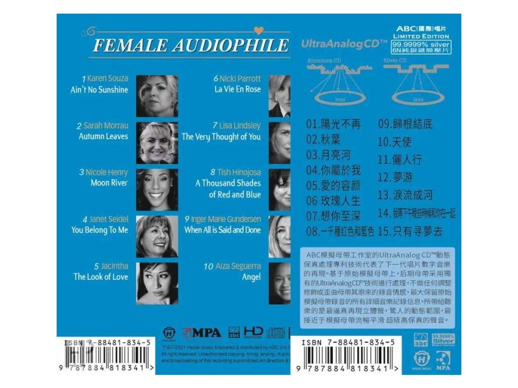 Novinka 2021 Album Title:Female Audiophile Voices V Item No:HDS-325 Artists :Various Artists Genre:Jazz vocal Company:ABC (Int'l)Records Female Audiophile VoicesⅠ - 6N 99,9999% Pure Silver Grand Master 01 Ain't No Sunshine Singer: Karen Souza 03:14 02 Autumn Leaves Singer: Sarah Morrau 04:56 03 Moon River Singer: Nicole Henry 05:09 04 You Belong To Me Singer: Janet Seidel 04:06 05 The Look of Love Singer: Jacintha 04:04 06 La Vie En Rose Singer: Nicki Parrott 02:37 07 The Very Thought of You Singer: Lisa Lindsley 06:35 08 A Thousand Shades of Red and Blue Singer: Tish Hinojosa 04:52 09 When All is Said and Done Singer: Inger Marie Gundersen 03:47 10 Angel Singer: Aiza Seguerra 04:42 11 Two for the Road Singer: Greta Matassa 05:47 12 Sleepwalk Singer: Renee Olstead 02:31 13 Cry Me A River Singer: Chantal Chamberland 02:53 14 I Wait For Late Afternoon And You Singer: Patricia Barber 05:16 15 All I Have To Do Is Dream Singer: Hayley Westenra 03:32Doplňkové parametry