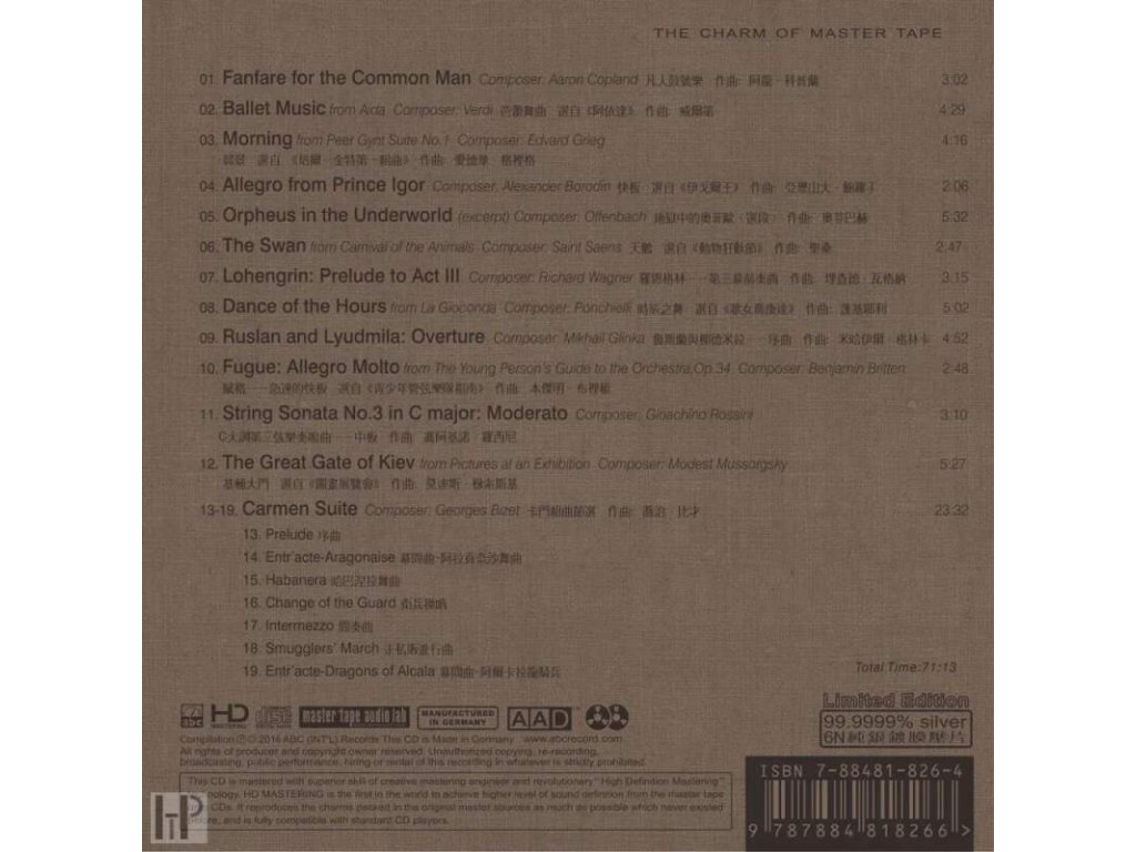 ABC Records - Grand Master - Top ClassicalGrand Master - Top Classical - Novinka 2024 Album Title:Grand Master - Top Classical Item No:HDS-242 Artists :Various Artists Genre:HIFI Test Company:ABC (Int'l)Records 01 Fanfare for the Common Man - Composer: Aaron Copland 3:02 02 Ballet Music from Aida - Composer: Verdi 4:29 03 Morning from Peer Gynt Suite No.1 - Composer: Edvard Grieg 4:16 04 Allegro from Prince Igor - Composer: Alexander Borodin 2:06 05 Orpheus in the Underworld (excerpt) - Composer: Offenbach 5:32 06 The Swan from Carnival Of The Animals - Composer: Saint Saens 2:47 07 Lohengrin: Prelude to Act III - Composer: Richard Wagner 3:15 08 Dance of the Hours from La Gioconda - Composer: Ponchielli 5:02 09 Ruslan and Lyudmila: Overture - Composer: Mikhail Glinka 4:52 10 Fugue: Allegro molto from The Young Person’s Guide to the Orchestra,Op.34 - Composer: Benjamin Britten 2:48 11 String Sonata No.3 in C major: Moderato - Composer: Gioachino Rossini 3:10 12 The Great Gate of Kiev from Pictures At An Exhibition - Composer: Modest Mussorgsky 5:27 13 Prelude from Carmen Suite - Composer: Georges Bizet 3:15 14 Entr’acte-Aragonaise from Carmen Suite - Composer: Georges Bizet 2:16 15 Habanera from Carmen Suite - Composer: Georges Bizet 2:01 16 Change of the Guard from Carmen Suite - Composer: Georges Bizet 3:38 17 Intermezzo from Carmen Suite - Composer: Georges Bizet 2:24 18 Smugglers’ March from Carmen Suite - Composer: Georges Bizet 5:27 19 Entr’acte-Dragoons of Alcala from Carmen Suite - Composer: Georges Bizet 4:33Doplňkové parametry