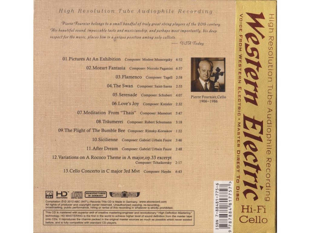 Western Electric Sound—Hi-Fi Cello Album Title:Western Electric Sound—Hi-Fi Cello Item No:HD-100 Artists :Various Artists Genre:Instrumental Music Company:ABC (Int'l)Records 01 Pictures At An Exhibition - Composer: Modest Mussorgsky 06:52 02 Mozart Fantasia - Composer: Niccolo Paganini 06:57 03 Flamenco - Composer: Tagell 02:58 04 The Swan - Composer: Saint-Saens 02:55 05 Serenade - Composer: Schubert 04:07 06 Love’s Joy - Composer: Kreisler 02:32 07 Meditation From “Thais” - Composer: Massenet 05:47 08 Träumerei - Composer: Robert Schumann 03:18 09 The Flight of The Bumble Bee - Composer: Rimsky-Korsakov 01:22 10 Sicilienne - Composer: Gabriel Urbain Faure 03:46 11 After Dream - Composer: Gabriel Urbain Faure 02:48 12 Variations on A Rococo Theme in A major,op.33 (excerpt) - Composer: Tchaikovsky 02:17 13 Cello Concerto in C major (3rd Mvt) - Composer: Haydn 06:43Doplňkové parametry