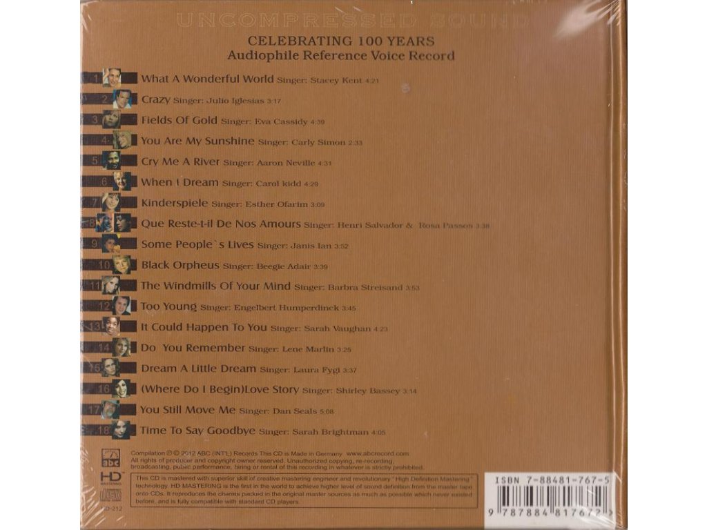 Referenční CD / HD Mastering / Natural Dynamics / Made in Germany / AAD HD-212 Label : ABC Int. Records 01 What A Wonderful World - Singer :Stacey Kent 04:21 02 Crazy - Singer:Julio Iglesias 03:17 03 Fields Of Gold - Singer:Eva Cassidy 04:39 04 You Are My Sunshine - Singer:Carly Simon 02:33 05 Cry Me A River - Singer:Aaron Neville 04:31 06 When I Dream - Singer:Carol kidd 04:29 07 Kinderspiele - Singer: Esther Ofarim 03:09 08 Que Reste-t-il De Nos Amours - Singer: Henri Salvador & Rosa Passos 03:38 09 Some People`s Lives - Singer:Janis Ian 03:52 10 Black Orpheus - Singer:Beegie Adair 03:39 11 The Windmills Of Your Mind - Singer:Barbra Streisand 03:53 12 Too Young - Singer: Engelbert Humperdinck 03:45 13It Could Happen To You Singer: Sarah Vaughan 04:23 14 Do You Remember - Singer:Lene Marlin 03:25 15 Dream A Little Dream - Singer:Laura Fygi 03:37 16 (Where Do I Begin) Love Story - Singer:Shirley Bassey 03:14 17 You Still Move Me - Singer :Dan Seals 05:08 18 Time To Say Goodbye - Singer :Sarah Brightman 04:05Doplňkové parametry
