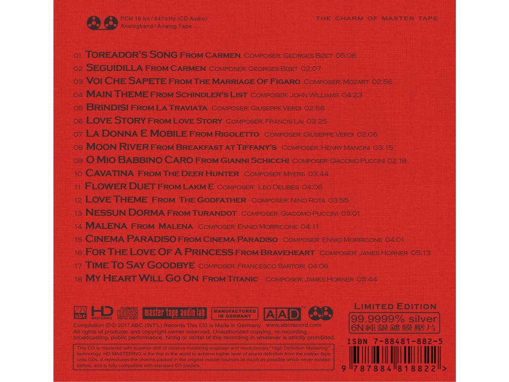 lbum Title:I’m So in Love with You-Cello Item No:HDS-095 Artists :Marc Coppey Genre:Instrumental Music Company:ABC (Int'l)Records - Limited edition / 6N 99,9999% Silver / AAD 01 Toreador’s Song From Carmen - Composer: Georges Bizet 05:06 02 Seguidilla From Carmen - Composer: Georges Bizet 02:07 03 Voi Che Sapete From The Marriage Of Figaro - Composer: Mozart 02:56 04 Main Theme From Schindler's List - Composer: John Williams 04:23 05 Brindisi From La Traviata - Composer: Giuseppe Verdi 02:56 06 Love Story From Love Story - Composer: Francis Lai 03:25 07 La Donna è Mobile From Rigoletto - Composer:Giuseppe Verdi 02:06 08 Moon River From Breakfast at Tiffany's - Composer: Henry Mancini 03:15 09 O Mio Babbino Caro From Gianni Schicchi - Composer:Giacomo Puccini 02:18 10 Cavatina From The Deer Hunter - Composer: Myers 03:44 11 Flower Duet From Lakmé - Composer: Leo Delibes 04:06 12 Love Theme From The Godfather - Composer: Nino Rota 03:55 13 Nessun Dorma From Turandot - Composer:Giacomo Puccini 03:01 14 Malena From Malena - Composer: Ennio Morricone 04:11 15 Cinema Paradiso - Composer: Ennio Morricone 04:01 16 For The Love Of A Princess From Braveheart - Composer: James Horner 05:13 17 Time To Say Goodbye - Composer: Francesco Sartori 04:06 18 My Heart Will Go On From Titanic - Composer: James Horner 05:44Doplňkové parametry