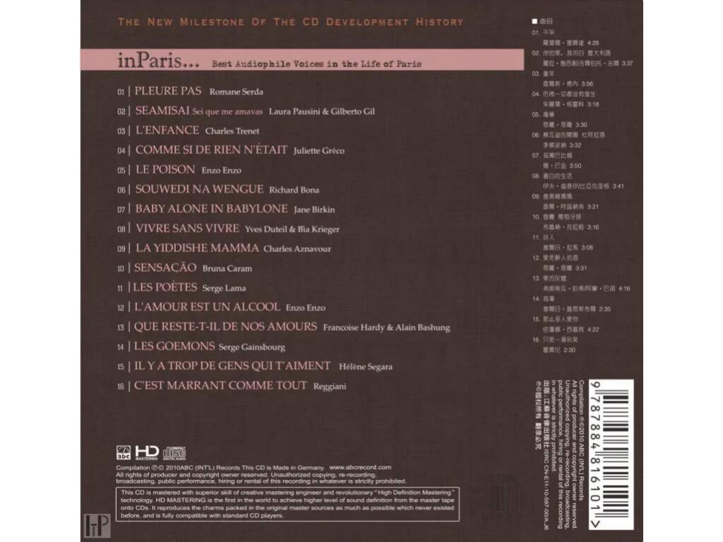 Referenční CD / HD Mastering / Natural Dynamics / Made in Germany/ Limited edition / AAD ABC Records - In Paris Album Title:ABC Records - In Paris Item No:HD-206 Genre:Popular Music Artists :Various Artists Company:ABC (Int'l)Records 01 Pleure pas - Singer: Romane Serda 04:28 02 Seamisai(Sei que me amavas) - Singer: Laura Pausini & Gilberto Gil 03:37 03 L`enfance - Singer: Charles Trenet 03:56 04 Comme si de rien n'était - Singer: Juliette Gréco 03:18 05 Le poison - Singer: Enzo Enzo 03:30 06 Souwedi na wengue - Singer: Richard Bona 03:32 07 Baby alone in Babylone - Singer: Jane Birkin 03:50 08 Vivre sans vivre - Singer:Yves Duteil & Bia Krieger 03:41 09 La Yiddishe mamma - Singer: Charles Aznavour 03:21 10 Sensacao - Singer: Bruna Caram 03:16 11 Les poètes - Singer: Serge Lama 03:08 12 L`amour est un alcool - Singer: Enzo Enzo 03:31 13 Que reste-t-il de nos amours - Singer: Francoise Hardy & Alain Bashung 04:16 14 Les Goemons - Singer:Serge Gainsbourg 02:35 15 II y a trop de gens qui t'aiment - Singer: Hélène Segara 04:22 16 Cest Marrant Comme Tout - Singer: Reggiani 02:30Doplňkové parametry