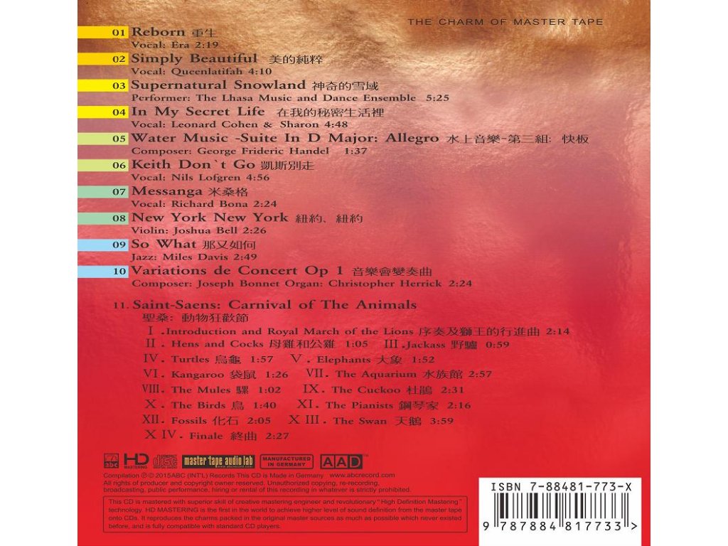 Live 8—30 Minutes’ Audio Test CD Album Title:Live 8—30 Minutes’ Audio Test CD Item No:HD-207 Artists :Various Artists Genre:Hi-Fi Test Company:ABC (Int'l)Records 01 Reborn - Vocal:Era 02:19 02 Simply Beautiful - Vocal:Queenlatifah 04:10 03 Supernatural Snowland - Performer:The Lhasa Music and Dance Ensemble 05:25 04 In My Secret Life - Vocal: Leonard Cohen & Sharon 04:48 05 Water Music -Suite in D Major: Allegro - Composer: George Frideric Handel 01:37 06 Keith Don`t Go - Vocal: Nils Lofgren 04:56 07 Messanga - Vocal:Richard Bona 02:24 08 New York New York - Violin:Joshua Bell 02:26 09 So What - Jazz:Miles Davis 02:49 10 Variations de Concert Op 1 - Composer:Joseph Bonnet Organ:Christopher Herrick 02:05 11 Carnival of The Animals - Composer:Saint-Saens 22:15Doplňkové parametry
