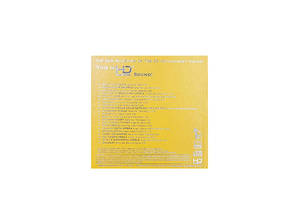 HD Mastering Test CD Sampler Label : ABC Int. Records Referenční výběrové CD 01 BWV. 565 Toccata - Composer: Bach 03:48 02 Friday Night Shuffle - Performer: Larry Carlton 02:21 03 Good bye - Performer: Cannonball Adderley 02:33 04 You Don’t Know What Love Is - Singer: Cassandra Wilson 03:52 05 Still In Love - Performer: Jaques Morelenbaum & Salvatore Bonafede 03:06 06 Jazz Variants - Performer: The O-zone Percussion Group 00:57 07 Grateful Singer: Brian Stokes Mitchell 02:50 08 Tango - Performer: Roger Woodward 02:30 09 Unaccompanied Cello Suite No.1 in G Major - Performer: Christopher Gordon 03:35 10 Rhapsody In Blue - Performer: The 5 Browns 01:05 11 M’Bifo - Singer: Rokia Traore 02:39 12 Duet - Performer: Dave Jones & Tom Gordon 01:36 13 Kitchen Racket Performer: The Cottars 01:45 14 Get It While It’s Hot - Singer: Eric Bibb 02:56 15 Be Be Creole - Performer: Toots Thielemans 02:48 16 Halala South Africa - Singer: Ladysmith Black Mambazo 02:46 17 Greensleeves Singer: Loreena McKennitt 04:35 18 Samba Do Marcos - Performer: Sadao Watanabe 02:47 19 Baltimore Oriole - Singer: Lorez Alexandria 03:07 20 What A Wonderful World - Singer: Louis Armstrong 02:15 21 Jealousy - Performer: Raymond Carter 03:34 Total Time 00:58:54Doplňkové parametry