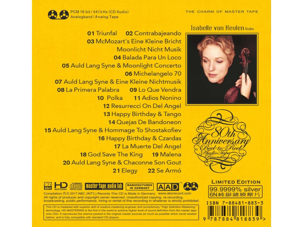 Album Title:Midnight Violin Item No:HDS-128 Artists :Isabelle van Keulen Genre:Instrumental Music Company:ABC (Int'l)Records 6N 99,9999% Silver / AAD - 80th Anniversary Reel to Reel Audio tape 01 Triunfal - Composed by Astor Piazzolla 01:12 02 Contrabajeando - Composed by Astor Piazzolla 04:11 03 McMozart's Eine Kleine Bricht Moonlicht Nicht Musik - Composed by Teddy Bor 03:23 04 Balada Para Un Loco - Composed by Astor Piazzolla 01:32 05 Auld Lang Syne & Moonlight Concerto - Composed by Franz Waxman 05:10 06 Michelangelo 70 - Composed by Astor Piazzolla 03:26 07 Auld Lang Syne & Eine Kleine Nichtmusik - Composed by Franz Waxman 02:41 08 La Primera Palabra - Composed by Astor Piazzolla 03:29 09 Lo Que Vendra - Composed by Astor Piazzolla 01:34 10 Polka - Composed by Alfred Schnittke 02:19 11 Adios Nonino - Composed by Astor Piazzolla 01:32 12 Resurreccion Del Angel - Composed by Astor Piazzolla 03:07 13 Happy Birthday & Tango - Arranged by Isabelle van Keulen 01:05 14 Quejas De Bandoneon - Composed by Astor Piazzolla 02:02 15 Auld Lang Syne & Hommage To Shostakofiev - Composed by Franz Waxman 01:54 16 Happy Birthday & Czardas - Arranged by Isabelle van Keulen 01:37 17 La Muerte Del Angel - Composed by Astor Piazzolla 03:24 18 God Save The King - Arranged by Isabelle van Keulen 03:05 19 Malena - Composed by Lucio Demare 02:43 20 Auld Lang Syne & Chaconne Son Gout - Composed by Franz Waxman 03:01 21 Elegy - Composed by Tchaikovsky 03:21 22 Se Armó - Composed by Astor Piazzolla 03:08 Total Time Isabelle van Keulen Classical music lovers all over the world will know her name: violinist Isabelle van Keulen(1966) is a soloist who, for many years now, has built a strong career worldwide. She plays with all the important orchestra’s, performs in the famous concert halls and keeps on recording extraordinary CD’s of a very high level. Now she dares to do something totally different! She wanted to do this for many years and now her dream can come true to play and record the music of Astor Piazzolla. This music she has loved since she was a child of six years old. This album not only gives us insight in Piazzolla himself but also tells more about the typical tango sound and how this is produced and why, according to the musicians, this music is so moving and goes straight to the heart! The worldwide growth of interest in Astor Piazzolla’s music may have slowed somewhat, but part of the appeal of his works lies in their protean adaptability to almost any instrumental combination, and performances by new groups continue to appear. Van Keulen’s group is a quartet, with violin (van Keulen herself), bandoneón, piano, and double bass. The result is a sort of distillation of Piazzolla’s compositions, more “classical” in its effect even than Gidon Kremer’s best-selling Piazzolla recordings, which have a good dose of fantasy overlaid on the music. The selection includes a good number of the best-known Piazzolla compositions, the most famous of all, “Adiós Nonino”, and “Balada Para Un Loco“. For newcomers to Piazzolla the best place to start is still probably with his own recordings, but this intriguingly dispassionate version will be of interest to those looking for ways to present Piazzolla in classical concert settings.Doplňkové parametry