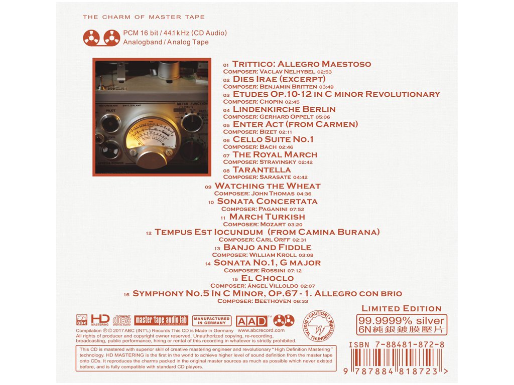 Referenční CD / HD Mastering / Natural Dynamics / Made in Germany/ Limited edition / 6N 99,9999% Silver / AAD - Master Tape Audio Lab HDS-126 Label : ABC Int. Records Limited edition / 6N 99,9999% Silver / AAD - Grand Master Tape Audio Lab When Acoustics Grand Master Meets High-End Audio 01 Trittico: Allegro Maestoso - Composer: Vaclav Nelhybel 02:53 02 Dies Irae (excerpt) - Composer: Benjamin Britten 03:49 03 Etudes Op.10-12 in C minor Revolutionary - Composer: Chopin 02:45 04 Lindenkirche Berlin - Composer: Gerhard Oppelt 05:06 05 Enter Act (from Carmen) - Composer: Bizet 02:11 06 Cello Suite No.1 - Composer: Bach 02:46 07 The Royal March - Composer: Stravinsky 02:42 08 Tarantella - Composer: Sarasate 04:42 09 Watching the Wheat - Composer: John Thomas 04:36 10 Sonata Concertata - Composer: Paganini 07:52 11 March Turkish - Composer: Mozart 03:20 12 Tempus est iocundum (from Camina Burana) - Composer: Carl Orff 02:31 13 Banjo and Fiddle - Composer: William Kroll 03:08 14 Sonata No.1, G major - Composer: Rossini 07:12 15 El Choclo - Composer: Ángel Villoldo 02:07 16 Symphony No.5 In C Minor, Op.67 - 1. Allegro con brio - Composer: Beethoven 06:33Doplňkové parametry