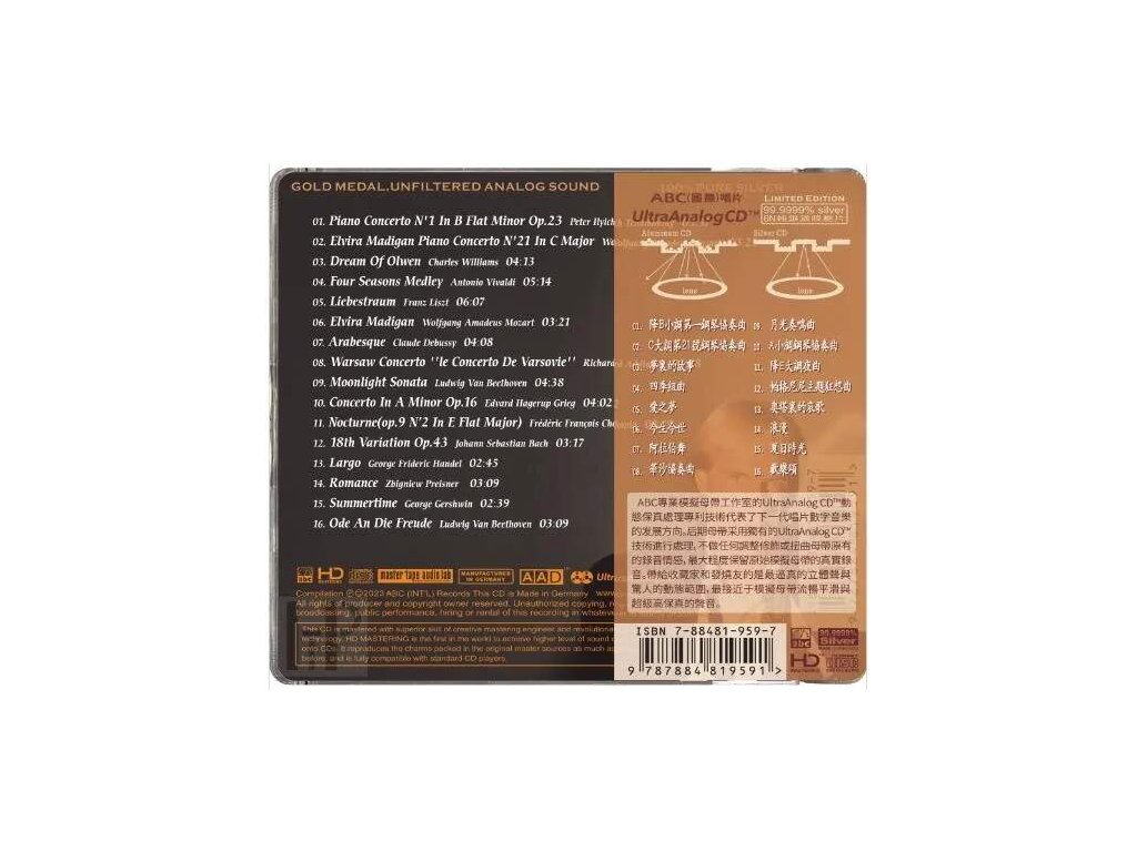 ABC Records - Richard Clayderman - Power Classics Album Title:ABC Records - Richard Clayderman - Power Classics Item No:HDS-362 Power Classics / Richard Clayderman Artists :Richard Clayderman / ABC [Power Classics / Richard Clayderman with The Royal Philharmonic Orchestra] Genre:Pianist Company:ABC (Int'l)Records - 6N 99,9999% Pure Silver 01 Piano Concerto No. 1 by Tchaikovsky02 Piano Concerto No. 21 by Mozart03 The Dream of Olwen by Charles Williams04 The Four Seasons by Antonio Vivaldi05 Liebestraum by Franz Liszt06 Elvira Madigan by Mozart07 Arabesque by Debussy08 Warsaw Concerto by Richard Addinsell09 Piano Sonata No. 14 by Beethoven10 Piano Concerto in A minor, Op. 16 by Grieg11 Nocturne No. 2 by Chopin12 Rhapsody on a Theme of Paganini, Variation No. 18 by Rachmaninoff13 Largo by Handel14 Romance by Zbigniew Preisner15 Summertime Composed by: Gershwin 16 Ode to Joy Composed by: BeethovenDoplňkové parametry