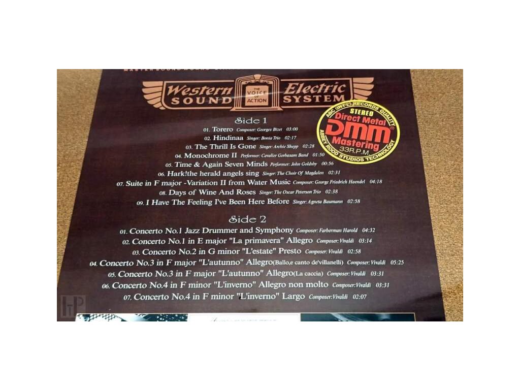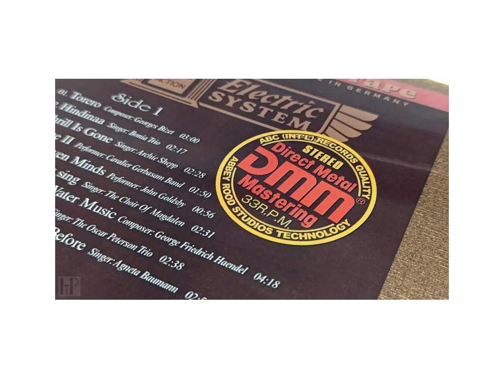 ABC Records - Stereo Test Record / Western Sound Electric System / 180G / DMM / Master tape Label : ABC Int. Records Manufactured in Germany Referenční Analog Mastering LP/ Natural Dynamics / 180g / DMM / Mastered at Abbey Road Studios / 33RPM / Audiophile Pressing / Limited Edition Side 1: 1. Torero - Composer: Georges Bizet 03:002. Hindinaa - Singer: Bonia Trio 02:173. The Thrill Is Gone - Singer: Archie Shepp 02:284. Monochrome II - Performer: Cavalier Gerbasam Band 01:505. Time & Again Seven Minds - Performer: JohnGoldshy00:566. Hark!the herald angels sing - Singer: The Choir Of Magdalen 02:317. Suite in F major - Variation II from Water Music - Composer: George Friedrich Haendel 04:188. Days of Wine And Roses Singer: The Oscar Peterson Trio 02:389. I Have The Feeling I've Been Here Before - Singer: Agneta Baumann 02:58 Side 2 1. Concerto No.1 Jazz Drummer and Symphony - Composer: Farberman Harold 04:322. Concerto No.1 in E major "La primavera" Allegro - Composer: Vivaldi 03:143. Concerto No.2 in G minor "L'estate" Presto - Composer: Vivaldi 02:584. Concerto No.3 in F major "L'autunno" Allegro(Ballo.e canto de'villanelli) - Composer: Vivaldi 05:25 5. Concerto No.3 in F major "L'autunno" Allegro(La caccia) - Composer: Vivaldi 03:316. Concerto No.4 in F minor "L'inverno" Allegro non molto - Composer: Vivaldi 03:317. Concerto No.4 in F minor "L'inverno" Largo - Composer: Vivaldi 02:07Doplňkové parametry