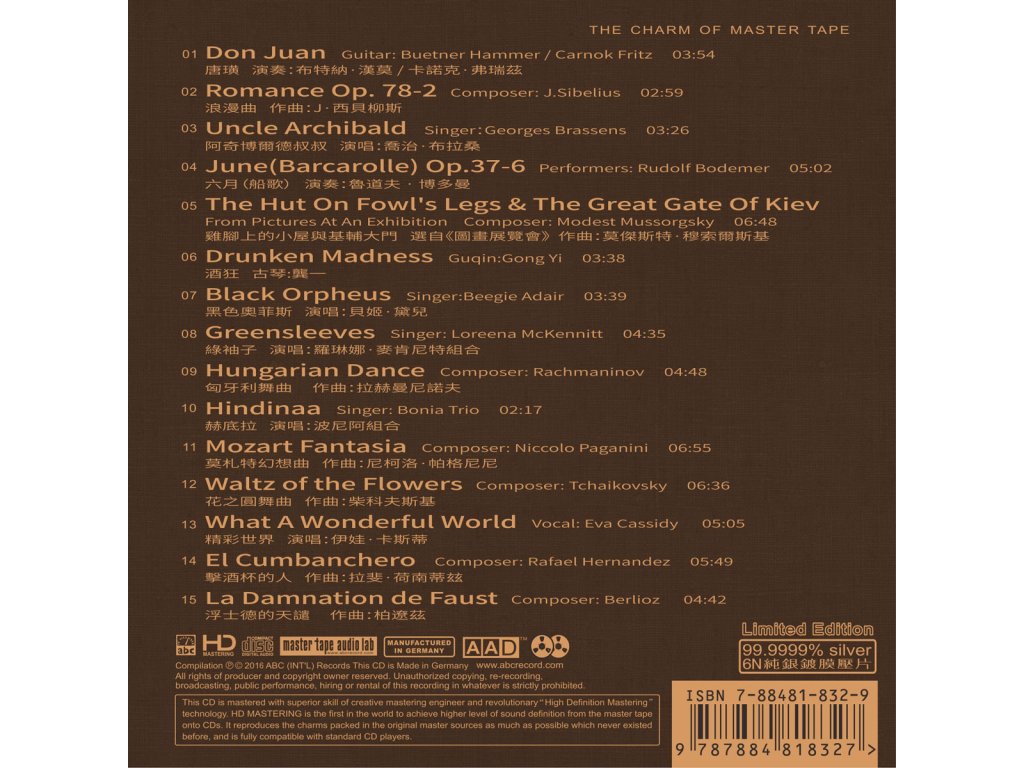 Referenční CD / HD Mastering / Natural Dynamics / Made in Germany/ Limited edition / 6N 99,9999% Silver / AAD HD-175 Label : ABC Int. Records 01 03:54 Don Juan From: Guitar Hits - Guitar: Buetner Hammer / Carnok Fritz 02 02:59 Romance Op. 78-2 From: Tube Hi-Fi Violin - Composer: J.Sibelius 03 03:26 Uncle Archibald From: 30 Years Tubes II - Singer:Georges Brassens 04 05:02 June(Barcarolle) Op.37-6 From: The Tube Hi-Fi Piano - Performers: Rudolf Bodemer 05 06:48 The Hut On Fowl's Legs & The Great Gate Of Kiev From Pictures At An Exhibition - Composer: Modest Mussorgsky 06 03:38 Drunken Madness From: Unique Music of Great Guqin - Guqin:Gong Yi 07 03:39 Black Orpheus From: His Master`s Voice - Singer:Beegie Adair 08 04:35 Greensleeves From: 300B Audiophile lmpressive Sounds - Singer: Loreena McKennitt 09 04:48 Hungarian Dance From: Royal Salon In Edinburgh - Composer: Rachmaninov 10 02:17 Hindinaa From: Live 10 - 30 Minutes’Audio Test CD - Singer: Bonia Trio 11 06:55 Mozart Fantasia From: The Tube Hi-Fi Cello - Composer: Niccolo Paganini 12 06:36 Waltz of the Flowers From: The Royal Ballet - Composer: Tchaikovsky 13 05:05 What A Wonderful World From: The Legendary Horn Ⅱ - Vocal: Eva Cassidy 14 05:49 El Cumbanchero From: Tube Hi-Fi Center Stage - Composer: Rafael Hernandez 15 04:42 La Damnation de Faust From: Beautiful Classic—Relaxing Melody - Composer: BerliozDoplňkové parametry