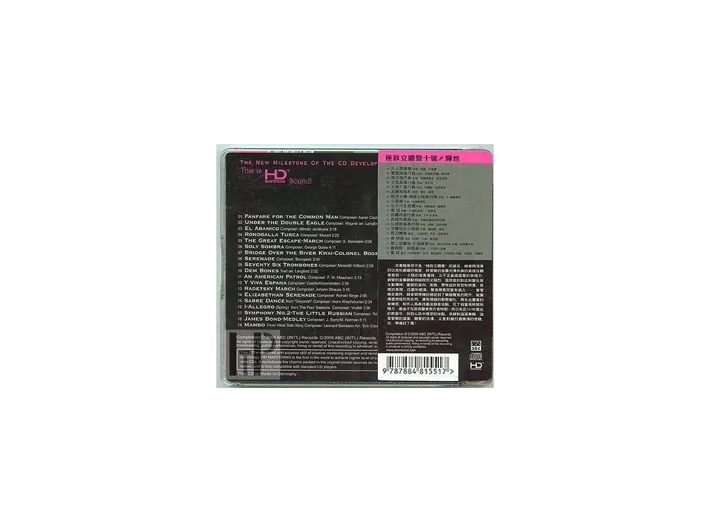 ABC Records - Supreme Stereo Sound No.10—Glory Album Title:Supreme Stereo Sound No.10—Glory Item No:HD-085 Artists :Various Artists Genre:Hifi Test - High Definition Mastering CD - Made in Germany Company:ABC (Int'l)Records 01 Fanfare for the Common Man - Composer: Aaron Copland 03:14 02 Under the Double Eagle - Composer: Wagner arr. Langford 04:01 03 El Abanico - Composer: Alfredo Javaloyes 03:18 04 Rondoalla Turca - Composer: Mozart 02:23 05 The Great Escape—March - Composer: E. Bernstein 02:04 06 Sol y Sombra - Composer: George Gates 04:11 07 Bridge Over the River Kwai—Colonel Bogey - Composer: K. Alford 03:14 08 Serenade - Composer: Bourgesis - 2:40 09 Seventy Six Trombones - Composer: Meredith Willson 02:08 10 Dem Bones - Trad arr. Langford 02:32 11 An American Patrol - Composer: F. W. Meacham 03:13 12 Y Viva Espana - Composer: Caerts/Rozenstraten 02:39 13 Radetsky March - Composer: Johann Strauss 03:16 14 Elizabethan Serenade - Composer: Ronald Binge 02:55 15 Sabre Dance from "Gayaneh" - Composer: Aram Khachaturian 02:34 16 I—Allegro (Spring) From The Four Seasons - Composer: Vivaldi 03:36 17 Symphony No.2-The Little Russian - Composer:Tchaikovsky 05:48 18 James Bond—Medley - Composer: J. Barry/M. Norman 06:11 19 Mambo From West Side Story - Composer: Leonard Bernstein 02:10Doplňkové parametry
