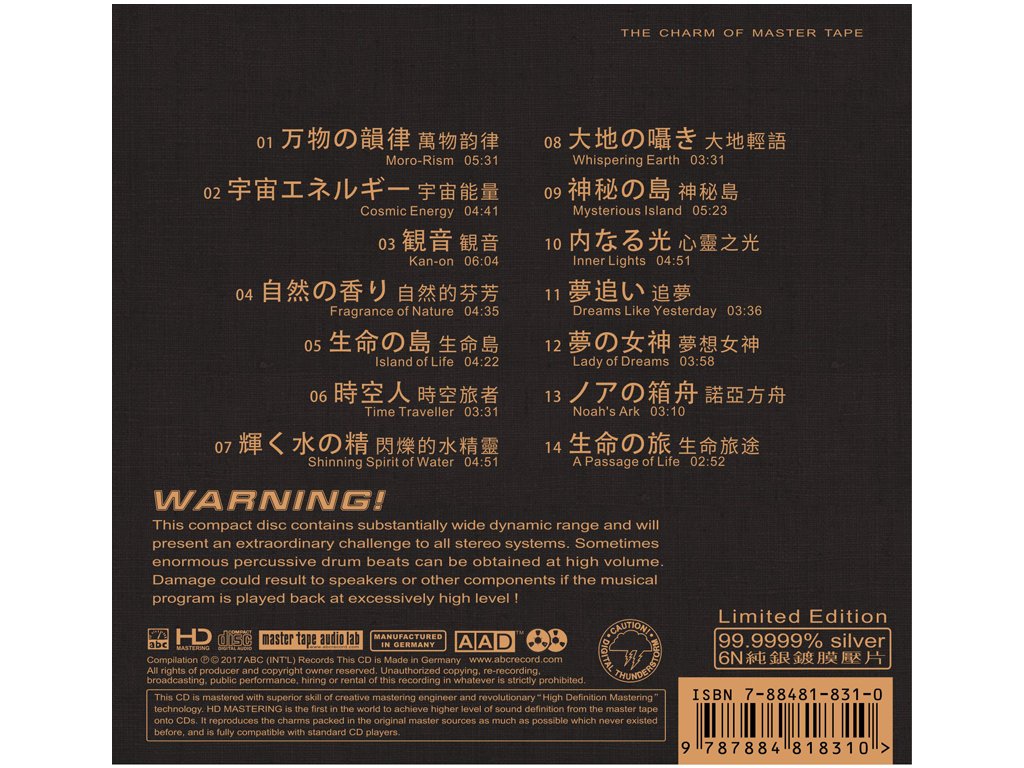 Album Title:TAIKO Drummers – Japanese Taiko Item No:HDS-055 Artists :St. Louis Osuwa Taiko Genre:World Music Company:ABC (Int'l)Records - 6N Silver 99.9999% Limited Edition 01 05:31 Moro-Rism / 万物の韻律 St. Louis Osuwa Taiko 02 04:41 Cosmic Energy / 宇宙エネルギー St. Louis Osuwa Taiko 03 06:04 Kan-on / 観音 St. Louis Osuwa Taiko 04 04:35 Fragrance Of Nature / 自然の香り St. Louis Osuwa Taiko 05 04:22 Island of Life / 生命の島 St. Louis Osuwa Taiko 06 03:31 Time Traveller / 時空人 St. Louis Osuwa Taiko 07 04:51 Shinning Spirit Of Water / 輝く水の精 St. Louis Osuwa Taiko 08 03:31 Whispering Earth / 大地の囁き St. Louis Osuwa Taiko 09 05:23 Mysterious Island / 神秘の島 St. Louis Osuwa Taiko 10 04:51 Inner Lights / 内なる光 St. Louis Osuwa Taiko 11 03:36 Dreams Like Yesterday / 夢追い St. Louis Osuwa Taiko 12 03:58 Lady of Dreams / 夢の女神 St. Louis Osuwa Taiko 13 03:10 Noah's Ark / ノアの箱舟 St. Louis Osuwa Taiko 14 02:52 A Passage of Life / 生命の旅 St. Louis Osuwa Taiko Total Time: 60:58Doplňkové parametry