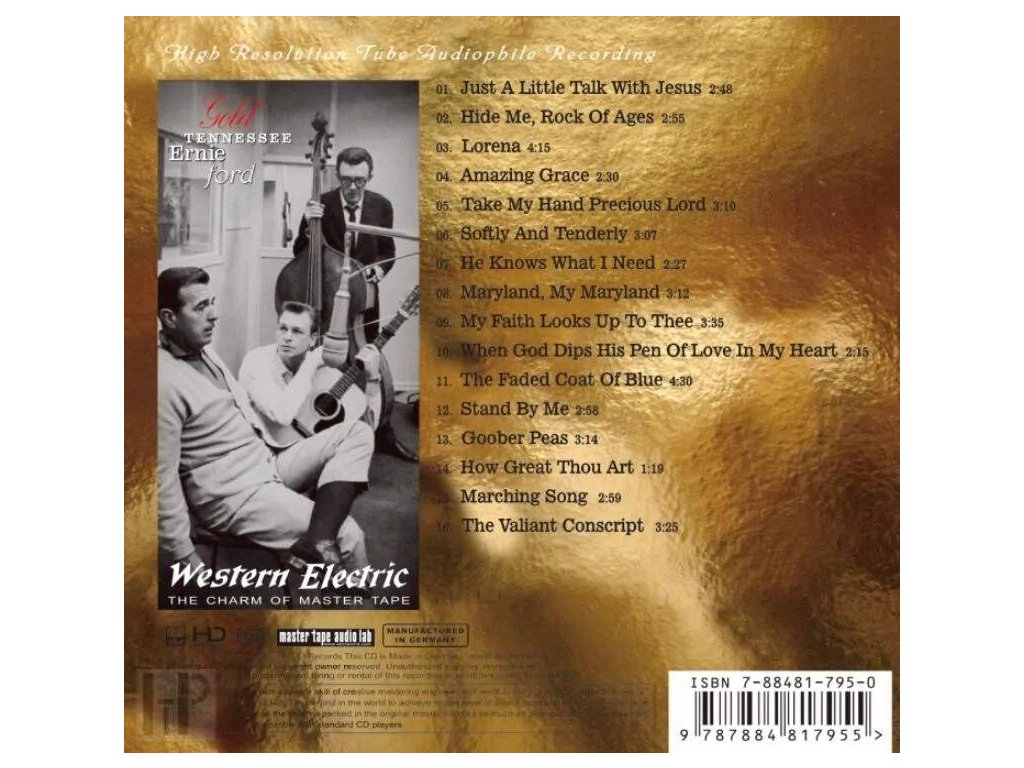 High Definition Mastering CD / AAD - Digital Copy Of The Master Tape Label : ABC Int. Records ABC Records - Tennessee Ernie Ford Název alba: Tennessee Ernie Ford (Gold Edition) Číslo alba: HD-220 Umělec: Tennessee Erney Ford Hudební styl: country zpěv Nahrávací společnost: ABC (International) Records01 02:48 Just A Little Talk With Jesus Singer: Tennessee Ernie Ford 02 02:55 Hide Me, Rock Of Ages Singer: Tennessee Ernie Ford 03 04:15 Lorena Singer: Tennessee Ernie Ford 04 02:30 Amazing Grace Singer: Tennessee Ernie Ford 05 03:10 Take My Hand Precious Lord Singer: Tennessee Ernie Ford 06 03:09 Softly And Tenderly Singer: Tennessee Ernie Ford 07 02:27 He Knows What I Need Singer: Tennessee Ernie Ford 08 03:12 Maryland, My Maryland Singer: Tennessee Ernie Ford 09 03:35 My Faith Looks Up To Thee Singer: Tennessee Ernie Ford 10 02:15 When God Dips His Pen Of Love In My Heart Singer: Tennessee Ernie Ford 11 04:30 The Faded Coat Of Blue Singer: Tennessee Ernie Ford 12 02:58 Stand By Me Singer: Tennessee Ernie Ford 13 03:14 Goober Peas Singer: Tennessee Ernie Ford 14 01:19 How Great Thou Art Singer: Tennessee Ernie Ford 15 02:59 Marching Song Singer: Tennessee Ernie Ford 16 03:25Doplňkové parametry