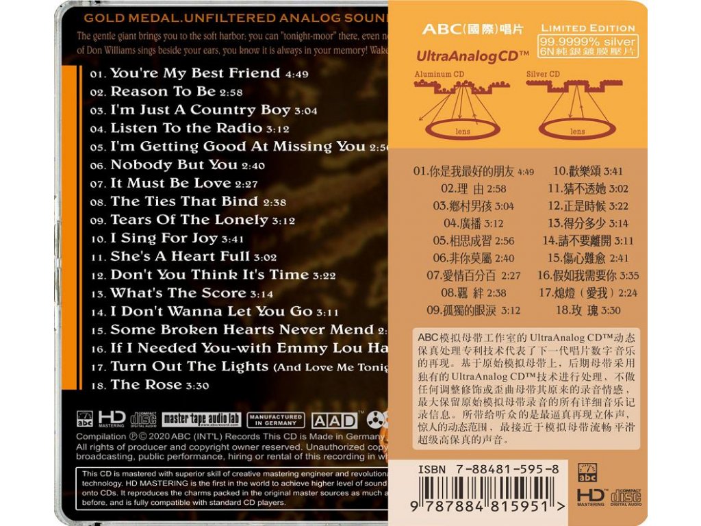 Don Williams—The 30th Anniversary Album Title:Don Williams—The 30th Anniversary Item No:HDS-174 Artists :Don Williams Genre:Country Music Company:ABC (Int'l)Records 01 You`re My Best Friend - Singer:Don Williams 04:49 02 Reason To Be - Singer:Don Williams 02:58 03 I’m Just A Country Boy - Singer:Don Williams 03:04 04 Listen To the Radio - Singer:Don Williams 03:12 05 I’m Getting Good At Missing You - Singer:Don Williams 02:56 06 Nobody But You - Singer:Don Williams 02:40 07 It Must Be Love - Singer:Don Williams 02:27 08 The Ties That Bind - Singer:Don Williams 02:38 09 Tears Of The Lonely - Singer:Don Williams 03:12 10 I Sing For Joy - Singer:Don Williams 03:41 11 She`s A Heart Full - Singer:Don Williams 03:02 12 Don`t You Think It`s Time - Singer:Don Williams 03:22 13 What`s the Score - Singer:Don Williams 03:14 14 I Don`t Wanna Let You Go - Singer:Don Williams 03:11 15 Some Broken Hearts Never Mend - Singer:Don Williams 02:41 16 If I Needed You - Singer:Don Williams with Emmy Lou Harris 03:35 17 Turn out the Lights(and Love Me Tonight) - Singer:Don Williams 02:24 18 The Rose - Singer:Don Williams 03:30Doplňkové parametry
