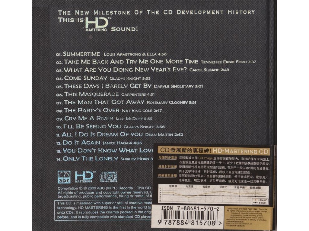Western Electric Sound—The Perfect Vocals Album Title:Western Electric Sound—The Perfect Vocals Item No:HD-182 Artists :Various Artists Genre:Hi-Fi Test Company:ABC (Int'l)Records 01 Summertime Louis Armstrong With Ella - Singer:Louis Armstrong With Ella 4:56 02 Take Me Back And Try Me One More Time - Singer:Tennessee Ernie Ford 02:37 03 What Are You Doing New Year`s Eve? - Singer:Carol Sloane 02:43 04 Come Sunday - Singer:Gladys Knight 05:33 05 These Days I Barely Get By - Singer:Daryle Singletary 03:01 06 This Masquerade - Singer:Carpenters 04:51 07 The Man That Got Away - Singer:Rosemary Clooney 05:51 08 The Party`s Over - Singer:Nat Kingcole 02:47 09 Cry Me A River - Singer:Jack McDuff 05:55 10 I'll Be Seeing You - Singer:Gladys Knight 03:56 11 All I Do Is Dream Of you - Singer:Dean Martin 02:42 12 Do It Again - Singer:Janice Hagaw 04:25 13 You Don't Know What Love Is - Singer:Dennis Rowland 05:33 14 Only The Lonely - Singer:Shirley Horn 03:04Doplňkové parametry