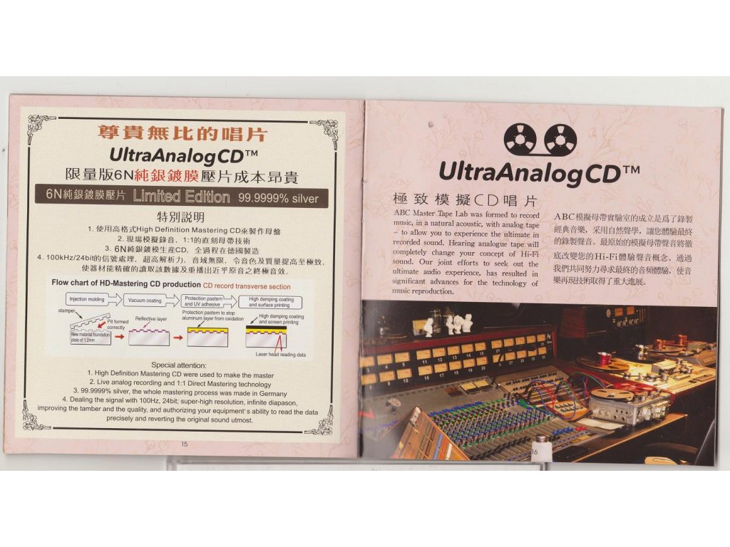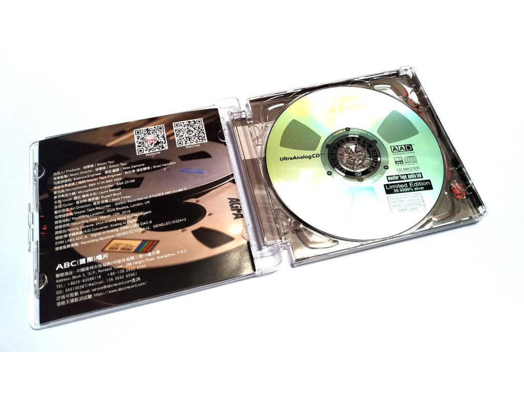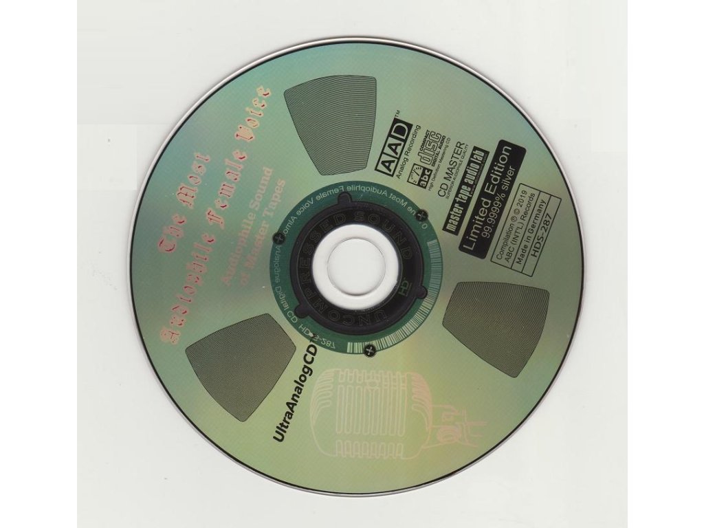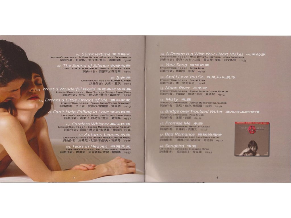 Referenční CD / HD Mastering / Natural Dynamics / Made in Germany/ Limited edition / 6N 99,9999% Silver / AAD HDS-287 Label : ABC Int. Records 01 Summertime - Composed by George Gershwin 03:06 02 What a Wonderful World - Composed by Bob Thiele 03:32 03 Tears in Heaven - Composed by Eric Clapton 04:33 04 Can't Help Falling in Love - Composed by Hugo Peretti 03:32 05 The Sound of Silence - Composed by Paul Simon 03:25 06 Careless Whisper - Composed by George Michael 03:56 07 Autumn Leaves - Composed by Joseph Kosma 03:15 08 Dream a Little Dream of Me - Composed by Fabian Andre 02:03 09 A Dream is a Wish Your Heart Makes - Composed by Mack David 02:55 10 Your Song - Composed by Elton John 04:03 11 And I Love You So -* Composed by Don McLean 04:18 12 Moon River - Composed by Henry Mancini 03:05 13 Misty - Composed by Erroll Garner 02:47 14 If - Composed by David Gates 02:53 15 Bridge over Troubled Water - Composed by Paul Simon 04:54 16 Promise Me - Composed by Beverley Craven 03:56 17 Bad Romance - Composed by Lady Gaga 04:11 18 Songbird - Composed by Christine McVie 02:49Doplňkové parametry