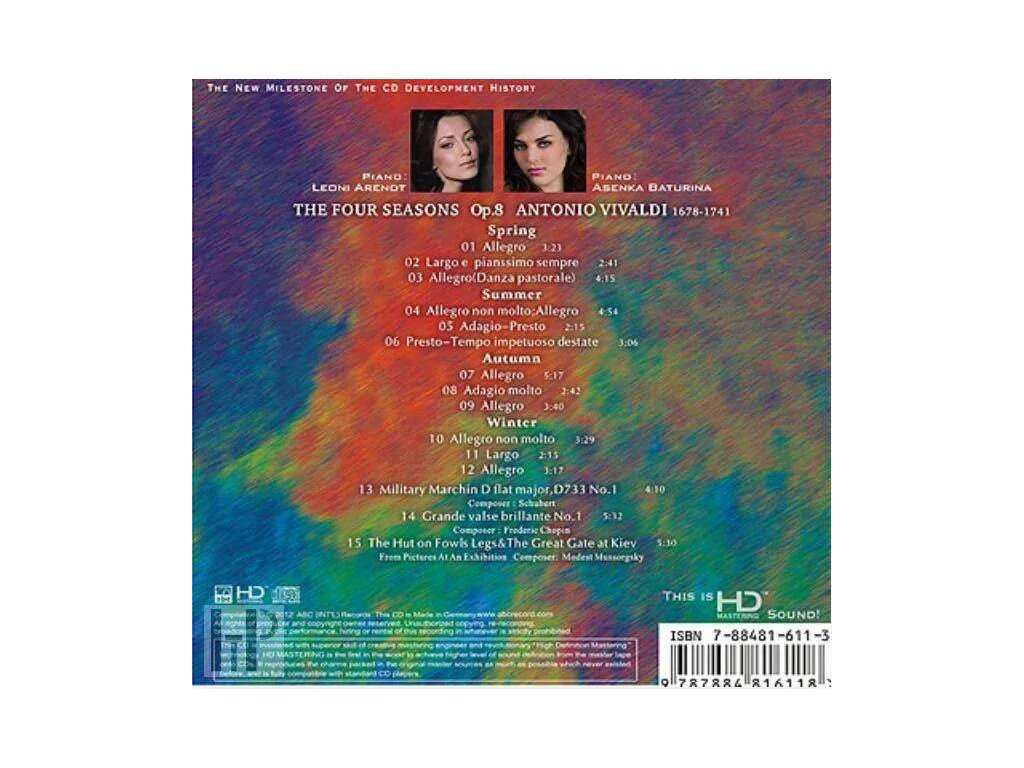Referenční CD / HD Mastering / Natural Dynamics / Made in Germany/ Limited edition / AAD ABC Records - Vivald: The Four Seasons Album Title:ABC Records - Vivald: The Four Seasons Item No:HD-184 Genre:Popular Music Artists :Leoni Arendt & Asenka Baturina Company:ABC (Int'l)Records 01 Spring-Allegro - Composer: Vivaldi 03:23 02 Spring-Largo e Pianissimo Sempre - Composer: Vivaldi 02:41 03 Spring-Allegro(Danza Pastorale) - Composer: Vivaldi 04:15 04 Summer-Allegro non molto; Allegro - Composer: Vivaldi 04:54 05 Summer-Adagio- Presto - Composer: Vivaldi 02:15 06 Summer-Presto-Tempo impetuoso d`estate - Composer: Vivaldi 03:06 07 Autumn-Allegro - Composer: Vivaldi 05:17 08 Autumn-Adagio molto - Composer: Vivaldi 02:42 09 Autumn-Allegro - Composer: Vivaldi 03:40 10 Winter-Allegro non molto - Composer: Vivaldi 03:29 11 Winter- Largo - Composer: Vivaldi 02:15 12 Winter-Allegro - Composer: Vivaldi 03:17 13 Military March in D flat major, D733 No.1 - Composer:Schubert 04:10 14 Grande valse brillante no.1 - Composer:Frederic Chopin 05:32 15 The Hut on Fowl's Legs & The Great Gate at Kiev - Composer: Modest Mussorgsky 05:30Doplňkové parametry