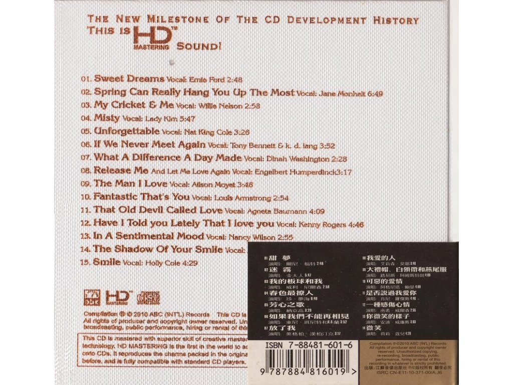 Western Electric Sound—Voice II Album Title:Western Electric Sound—Voice II Item No:HD-201 Artists :Various Artists Genre:Hi-Fi Test Company:ABC (Int'l)Records 01 Sweet Dreams - Singer:Tennessee Ernie Ford 02:48 02 Spring can Really Hang You Up the Most - Singer:Jane Monheit 06:49 03 My Cricket & Me - Singer:Willie Nelson 02:58 04 Misty - Singer:Lady Kim 05:47 05 Unforgettable - Singer:Nat King Cole 03:26 06 If We Never Meet Again - Singer:Tony Bennett & K.D. Lang 03:52 07 What A Difference A Day Made - Singer:Dinah Washington 02:28 08 Release Me(And Let Me Love Again) - Singer:Engelbert Humperdinck 03:17 09 The Man I Love - Singer:Alison Moyet 03:46 10 Fantastic That's You - Singer:Louis Armstrong 02:54 11 That Old Devil Called Love - Singer:Agneta Baumann 04:09 12 Have I Told you Lately That I love you - Singer:Kenny Rogers 04:46 13 In A Sentimental Mood - Singer:Nancy Wilson 02:55 14 The Shadow Of Your Smile - Singer:Andy Williams 03:03 15 Smile - Singer: Holly Cole 04:29Doplňkové parametry