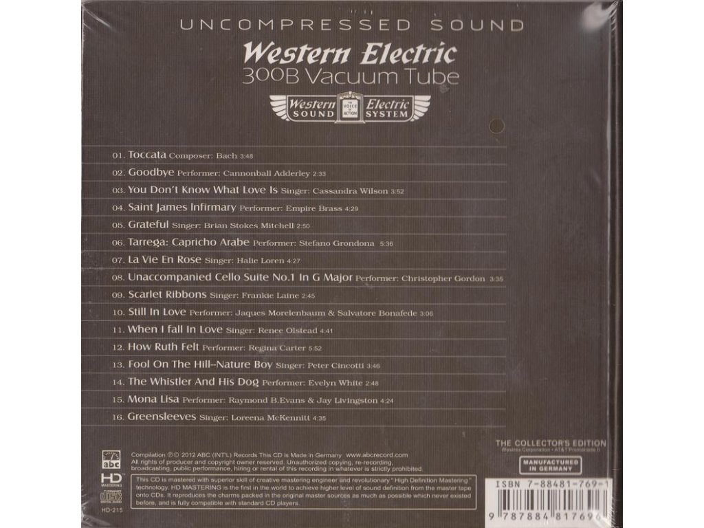 Referenční CD / HD Mastering / Natural Dynamics / Made in Germany/ Western Electric Series HD-215 Made in Germany Label : ABC Int. Records 01 BWV. 565 Toccata - Composer: Bach 03:48 02 Goodbye - Performer: Cannonball Adderley 02:33 03 You Don’t Know What Love Is - Singer: Cassandra Wilson 03:52 04 Saint James lnfirmary - Performer: Empire Brass 04:29 05 Grateful - Singer: Brian Stokes Mitchell 02:50 06 Tarrega:Capricho Arabe - Performer:Stefano Grondona 05:36 07 La Vie En Rose - Singer:Halie Loren 04:27 08 Unaccompanied Cello Suite No.1 In G Major - Performer: Christopher Gordon 03:35 09 Scarlet Ribbons - Singer:Frankie Laine 02:45 10 Still In Love - Performer: Jaques Morelenbaum & Salvatore Bonafede 03:06 11 When I fall In Love - Singer:Renee Olstead 04:41 12 How Ruth Felt - Performer:Regina Carter 05:52 13 Fool On The Hill--Nature Boy - Singer:Peter Cincotti 03:46 14 The Whistler And His Dog - Performer:Evelyn White 02:48 15 Mona Lisa - Performer:Raymond B.Evans,Jay Livingston 04:24 16 Greensleeves - Singer: Loreena McKennitt 04:35Doplňkové parametry