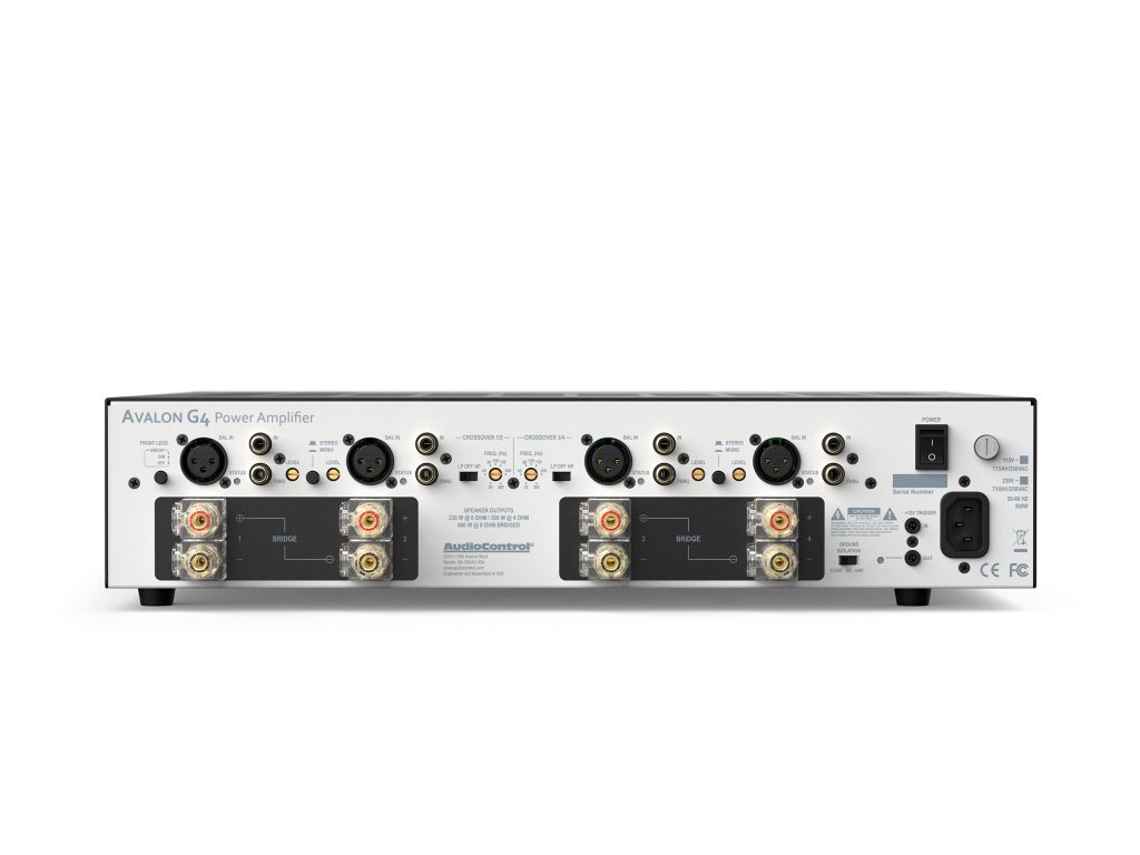 AVALON G4 4-kaná lový pré miový zesilovač pro sestavy domá cí ho kina. Avalon G4 nabí zí vý kon 230Watt/kaná l při 8 Ohmech a 300Watt/kaná l při 4 Ohmech. Avalon G4 může bý t také zapojena do můstku, což přinese vý kon 600Watt do 8 Ohmů na vybraný ch kaná lech. Avalon G4 má ve&scaron keré ochrany k  zamezení po&scaron kození připojený ch reprosoustav. Avalon G4 dodá předzesilovačům Audio Control patřičný vý kon a detailní , dynamický a kultivovaný zvukový projev. VLASTNOSTI 4-kaná lový koncový zesilovač pro domá cí kino s  řadou prestižní ch ocenění Pracuje v  různý ch režimech zapojení : 4kaná l, 2.1 , 2-kaná l Vý kon 4 x 230 Watt/kaná l do 8 Ohm Vý kon 4 x 300 Watt/kaná l do 4 Ohm Možnost můstkovat s vý konem 600 Watt/8 Ohm Stabilní i při niž&scaron í impedanci reproduktorů Stereo/mono provoz Nesymetrické RCA vstupy Symetrické XLR vstupy 12V trigger in/out Designová n pro provoz domá cí ho kina VSTUPY 4x RCA nesymetricky, 4x XLR symetricky Vý stupní citlivost: 1.42 Vrms pro v&scaron echny vý stupy/max. hlasitost Max. vstupní ú roveň: 2.7 Vrms Vstupní impedance: 100 kOhm   VÝ STUPY Počet kaná lů zesilovače: 4x Vý stupní vý kon : 230Watt/8Ohm Vý stupní vý kon : 300Watt/4Ohm Vý stupní vý kon (do můstku): 600 Watt Minimá lní impedance: 4 Ohm OVLÁ DÁ NÍ Spí ná ní (trigger): +12VDC SPOTŘEBA Standby: 2 Watt Hlasitý poslech: 400 Watt Max. spotřeba: 1200 Watt PARAMETRY Damping faktor: ví ce než 450 Odstup signá l/&scaron um: 102dB Kmitočtový rozsah: 10 &ndash 20  000 Hz Vá ha a rozměry: Rozměry (&scaron xvxh):430x419x89 mm Vá ha: 17.2kg  Doplňkové parametry