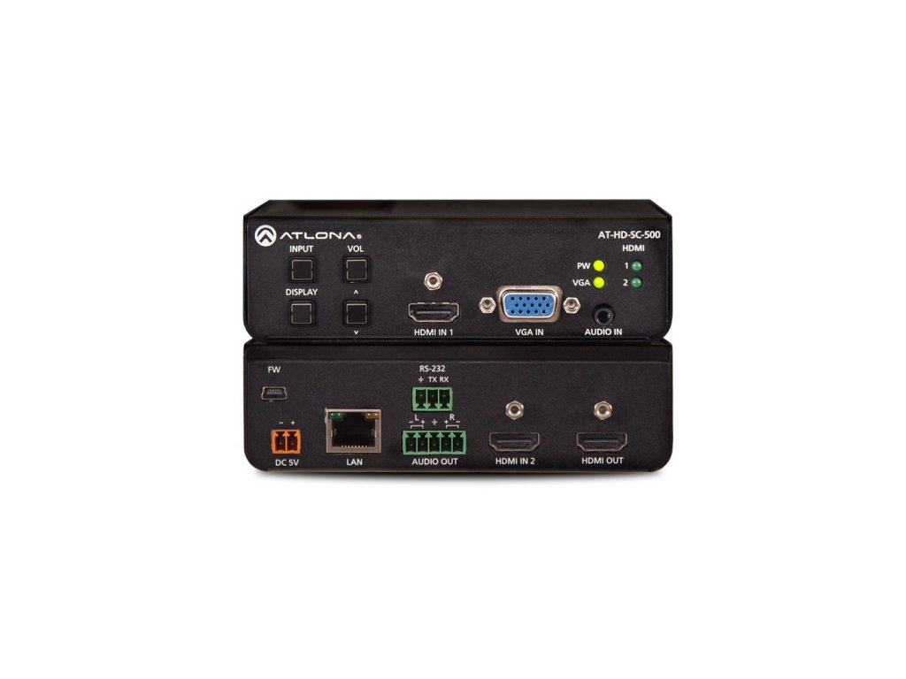 Atlona AT-HD-SC-500 je scaler se zabudovaným 3x1 přepínačem pro HDMI a VGA signály, 2x HDMI vstup, 1x VGA vstup, automatické přepínání, TCP/IP, RS-232, ovládání hlasitosti na předním panelu spolu s volbou vstupu, symetrický audio výstup, audio de-embedding, výrobce: Atlona, model: AT-HD-SC-500 Atlona AT-HD-SC-500 je scaler se zabudovaným 3x1 přepínačem pro HDMI a VGA signály. Nabízí 2x HDMI vstup a 1x VGA vstup s 3,5 mm audio konektorem. Tento scaler přenáší video signály z jiných přepínačů, PC nebo laptopů, scaluje je na HDMI výstup ve vysokém rozsahu HDTV a PC rozlišení až 1080p/60 Hz a WUXGA (1920x1200). Nabízí také funkci automatického přepínání umožňující vybrat vstup podle připojení aktivního zdroje nebo jeho statusu. Vstup je také možné vybrat na předním panelu, pomocí RS-232 nebo TCP/IP. Nastavení lze provádět pomocí WebGUI nebo OSD. Nastavit lze různé vstupní a výstupní rozlišení spolu s jasem, kontrastem, sytostí, barvou a ostrostí. AT-HD-SC-500 je ideální pro instalace, ve kterých je použito více signálů s různým rozlišením, které je třeba přizpůsobit zobrazovači. Může být také použit jako vstupní zařízení u přepínače, který nemá VGA vstup, nebo také jako scaler na výstupu například pro AT-UHD-CLSO-824 maticový přepínač. Scaler s HDMI výstupem a možností ovládání vstupního rozlišení Možnost scalování výstupních video signálů až 1080p/60Hz a 1920x1200; jako vstupní rozlišení můžete vybrat z 800x600 až 1920x1200 Zajistí kompatibilitu VGA a HDMI zdrojů se zobrazovačem Přepínač se třemi vstupy Nabízí 2x HDMI vstup a 1x VGA vstup s 3,5 mm audio konektorem Umožňuje použití moderních HDMI zobrazovačů se staršími VGA zdroji Automatické přepínání Zvolí aktivní vstup z připojených zdrojů, nebo podle změny stavu zdroje (zapnutí/vypnutí) Eliminuje potřebu složitého řídicího systému v AV systémech Dva HDMI vstupy Digitální vstupy pro podporu až dvou HDMI zdrojů nebo DisplayPortu a DVI zdroje s odpovídajícími adaptéry Ideální při použití více digitálních zdrojů včetně notebooků, PC a kamer Jeden analogový video vstup s 15-pin HD konektorem Přenáší RGBHV signály pomocí adaptérů a breakout kabelů Možnost zapojení starších analogových zdrojů TCP/IP a RS-232 Je kompatibilní s jinými řídicími systémy, což zvyšuje jeho flexibilitu Snižuje čas a náklady integrace Tlačítko Input Select na předním panelu Pokud jsou aktivní dva zdroje, je možné zvolit zdroj pomocí tlačítka místo automatického přepínání Ovládání hlasitosti na předním panelu Změna úrovně hlasitosti odděleného i sloučeného zvuku Režim Mute Audio de-embedding Odděluje PCM zvuk z HDMI vstupů na analogový audio výstup Zajistí přenos audio signálu do celého zvukového systému Symetrický audio výstup Profesionální symetrický +4dBu audio výstup s 5-pin svorkovnicovým konektorem Rychlá integrace s profesionálním zvukovým systémemDoplňkové parametry