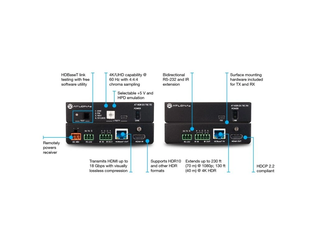 Atlona AT-HDR-EX-70C-KIT je 4K HDR extender HDBaseT KIT vysílače a přijímače, 4K/UHD/60 Hz, 4K HDR, PoE, až do 70 m, RS-232, IR, HDCP 2.2, možnost uchycení do racku, výrobce: Atlona, model: AT-HDR-EX-70C-KIT HDR-EX-70C-KIT je ideální pro domácí i komerční instalace s nejnovějšími 4K/UHD a HDR zařízeními a displeji. Je kompatibilní se všemi rozlišeními videa, audio formáty plus má schopnost přenášet metadata pro HDR. 4K/UHD @ 60 Hz 4:4:4, podpora HDR Ideální pro nové 4K/UHD a HDR zařízení a displeje Kompatibilní s 4K HDR10 @ 60 Hz a Dolby®Vision™ @ 30 Hz Plně podporuje všechny rozlišení videa a audio formáty HDBaseT extender kit pro HDMI prodloužením až do 70 metrů Prodlužuje HDMI až do 70 metrů s rozlišením 1080p a do 40 metrů 4K HDR s použitím CAT6a/7 kabelu* * Pro dosažení optimálního výkonu HDBaseT je doporučen stíněný kabel CAT6a or CAT7 Kompatibilní s HDCP 2.2 Odpovídá posledním specifikacím HDCP Umožňuje streamování chráněného obsahu mezi zařízeními Kompatibilní s multikanálovým audiem Podporuje PCM, Dolby Digital, Dolby Digital Plus, Dolby TrueHD, Dolby Atmos, DTS Digital Surround a DTS-HD Master Audio Umožňuje zpracování jakéhokoli multikanálového streamu profesionálním zvukovým systémem Přijímač napájen vysílačem přes PoE (Power over Ethernet) Napájení přijímače je dodáváno vysílačem přes HDBaseT Snadná aktualizace firmwaru Pro aktualizaci použijte USB port na předním panelu Testování HDBaseT K dispozici je bezplatný software pro testování integrity kabelového propojení HDBaseT mezi vysílačem a přijímačem Ukazuje aktuální stav spojení a podrobné informace o signálu HDBaseT a HDMI Rychlé a snadné ověření nebo řešení potíží s RJ-45 LED indikátory Power a Link na předním panelu Zobrazují informace ohledně napájení a HDBaseT RS-232, IR a CEC přes HDBaseT Obousměrné rozšíření pro RS-232 a IR Nabíjení pomocí jednoho zařízení Jedno zařízení poskytuje energii až třem Atlona extenderovým sadám Čtyři extenderové sady od Atlony mohou být napájeny doplňkovým zdrojem – AT-PSU-48V 1,25 A Redukuje se tím nepřehledné množství zdrojů napájení Vizuálně bezztrátová komprese Umožňuje HDBaseT přenos HDMI až do rychlosti 18 Gbps s použitím extrémně lehké komprese obrazu bez latence Inovativní řešení pro rozšíření signálu poskytuje velmi vysokou, nedotčenou kvalitu obrazu Nízký, 25 mm vysoký, ¼ racku široký Snadná instalace do montážních úchytů i do stísněných prostorů za zobrazovači Na veřejných místech jej tak můžete schovat před zrakem ostatních Přiložené příslušenství manuál, montážní konzoly, IR emitter a externí napájecí zdroj K dispozici také AT-IR-CS-RX IR přijímačDoplňkové parametry
