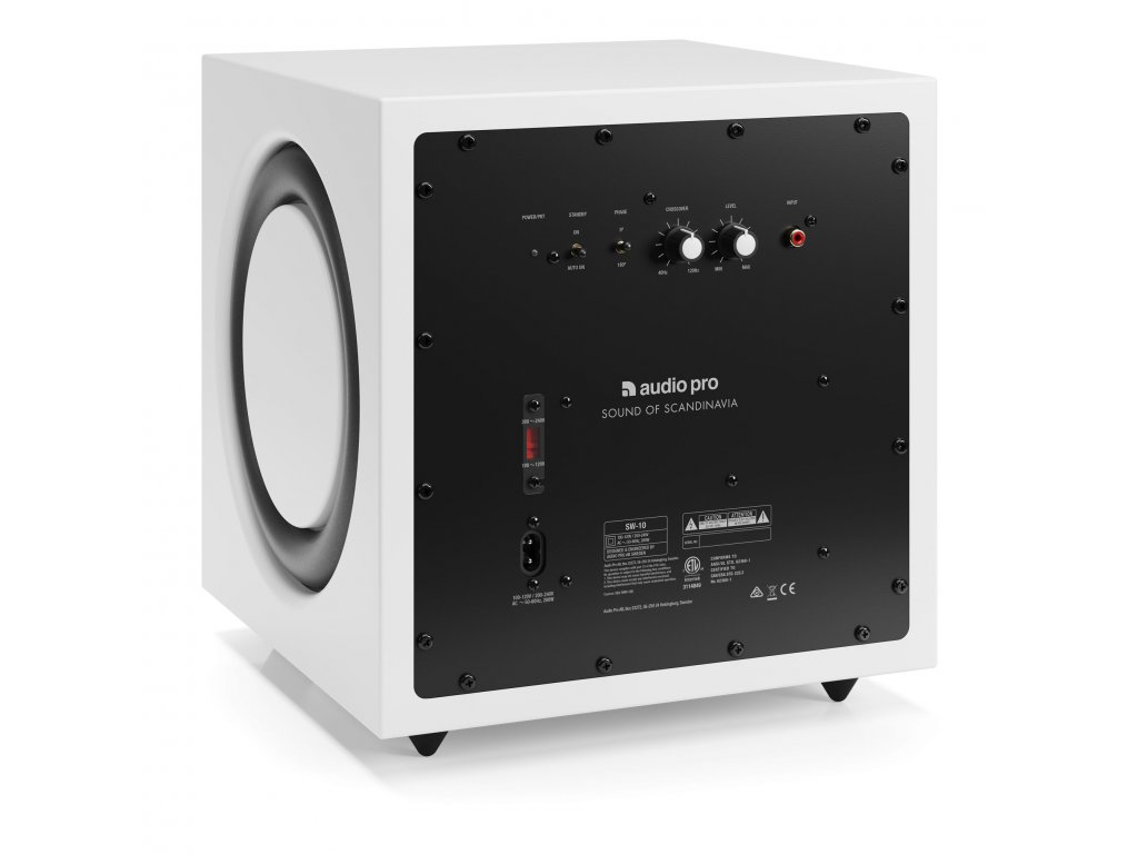 Audio Pro SW-10 Subwoofer Audio Pro SW-10 je ideá lní m prvkem audio sestav jak pro stereo provoz, tak i pro domá cí kino. SW-10 je vyladěna tak, aby přesně a s razancí exceloval v dynamický ch pasá ží ch. Signá lový vstup do subwooferu je RCA. Zesilovač má vý kon 200 Watt, pracuje ve tří dě D, využí vá DSP. Aktivní měnič je 8" , doplněn je o dva pasivní , 9" zá řiče. Pracovní kmitočet je v rozmezí 33 - 120 Hz. Rozměry subwooferu jsou (&scaron xvxh): 280x280x295 mmDoplňkové parametry