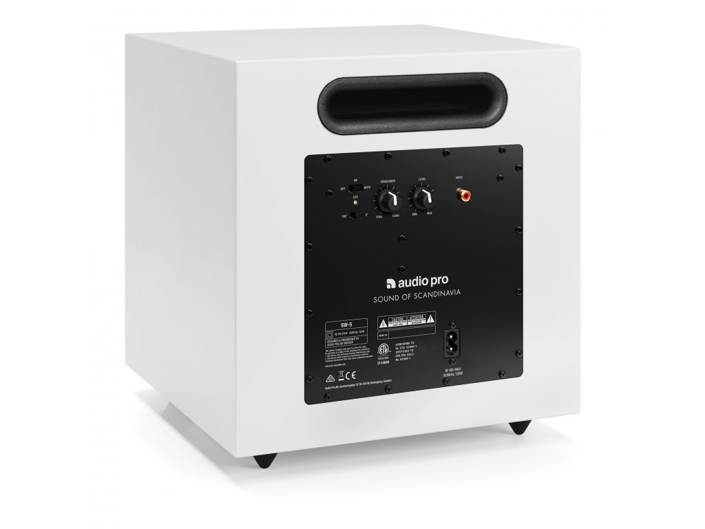 Audio Pro SW-5 Audio Pro SW-5 je subwoofer men&scaron í ch rozměrů, doká že ale zaplnit men&scaron í prostory hutný mi a pevný mi basy. Subwoofer má ladné , čisté linie, perfektně zapadne do moderní ch interié rů. Má RCA vstup pro projení se zesilovačem. V&scaron echny prvky nastavení jsou na zadní m panelu.  Doplňkové parametry