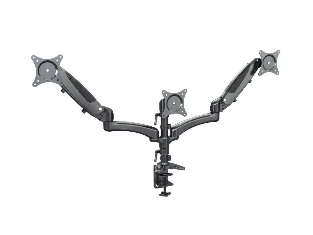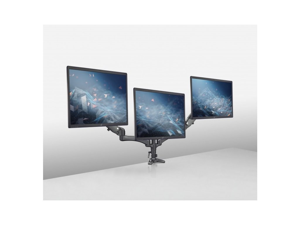 Držák na 3 monitory. Vhodný pro monitory do velikosti 24". Robustní hliníková konstrukce s integrovanou plynovou pružinou. Nosnost každého ramene až 8 kg. Připevňovací desky je navrženy pro velikosti VESA 75/75 a 100/100. Držák se připevňuje k desce stolu pomocí svorky s upínacím rozsahem tloušťky desky do 85 mm. Rychlá instalace. Nastavní výšky prostředního držáku do 160 mm. Vnější ramena lze nastavit do výšky 350 mm. Každou hlavu lze plynule naklánět a otáčet podle potřeby. Integrované umístění kabelů zaručuje čistý pracovní prostor. Vyrábí se v černé barvě.