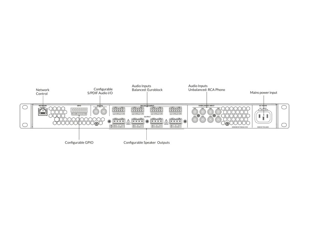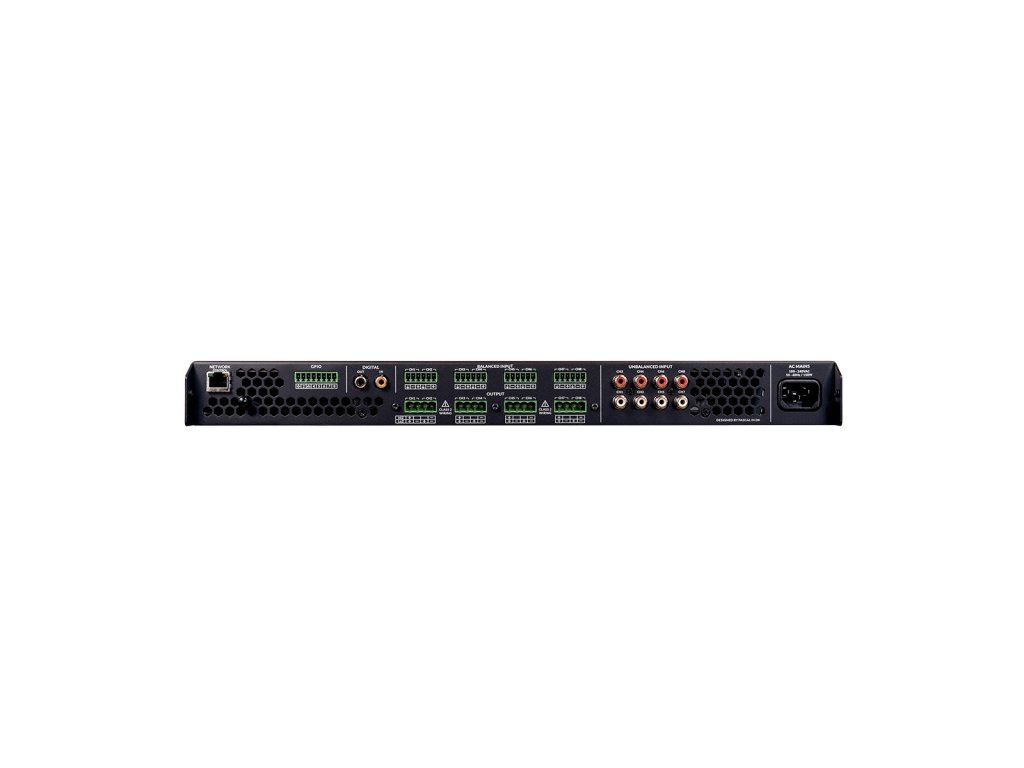 | Vstupy: | 1 x digitální koaxiální, 8 x symetrický linkový Euroblock vstup, 8 x linkový RCA vstup, 1 x ethernet RJ45, 1 x GPIO Euroblock |
