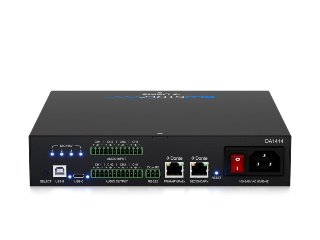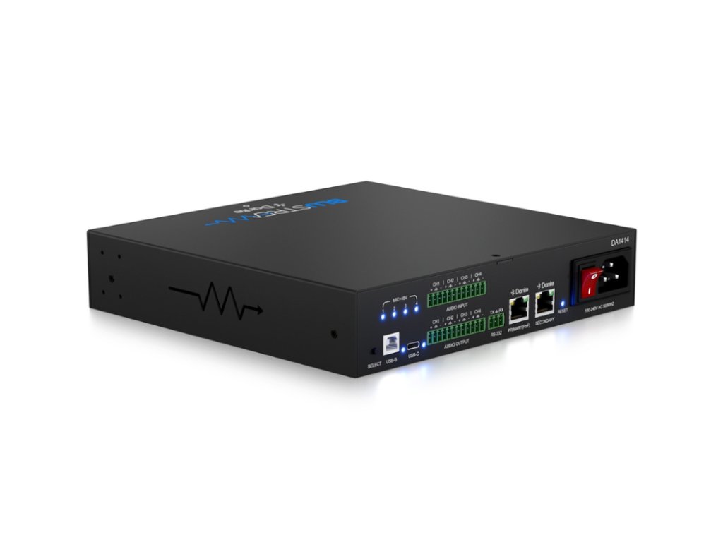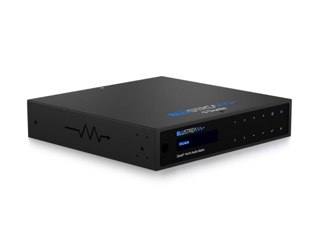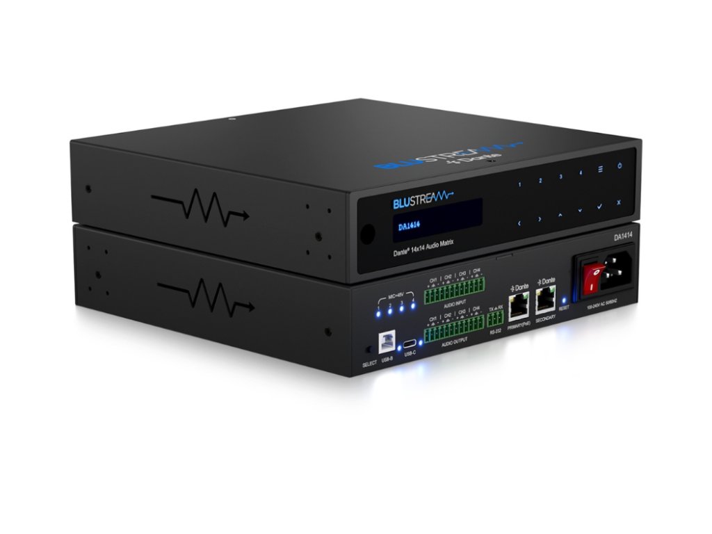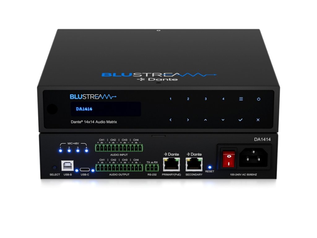 Blustream DA1414 audio matice Blustream DA1414 je profesionální zvuková matice s napájením PoE+, která umožňuje flexibilní směrování a zpracování více audio vstupů v komerčních i rezidenčních vícezónových instalacích. Podporuje Dante/AES67, analogové a USB vstupy a nabízí pokročilé funkce jako směrování signálu, mixování, parametrický ekvalizér a integraci s řídicími systémy třetích stran.Je vybaven 8 x Dante/AES67, 4 x vyváženým/nesymetrickým analogovým a 2 x USB audio vstupy, podporuje maticové směrování a zpracování na 8 x Dante/AES67, 4 x vyvážený/nevyvážený analogový a 2 x USB audio kanály.Analogové vstupy jsou vybaveny volitelným 48V fantomovým napájením pro připojení mikrofonu nebo linkové úrovně. Možnosti připojení USB-C / USB-B navíc zajišťují maximální flexibilitu, která je vhodná pro mnoho různých návrhů systémů. Klícové vlastnosti: 14×14 audio matice s konektivitou Dante/AES67, vyváčeným/nesymetrickým analogovým a USB audio rozhraním Podporuje oddělení všech audio kanálů na mono se samostatným řízením, umožňuje směrování až 14×14 audio zdrojů Analogové audio vstupy podporují vyvážené i nevyvážené signály na úrovni linky a mikrofonu Mikrofonní vstupy podporují 48V fantomové napájení Volitelný USB audio vstup přes USB-C a USB-B s podporou USB Audio Class 2.0 Pokročilé zpracování signálu: ovládání hlasitosti, vyvážení, 8pásmový parametrický ekvalizér s horní/dolní policí a propustí pro každý vstupní a výstupní kanál Podporuje 48 kHz / 24bit A/D a D/A konverzi Kompatibilní se vzorkovacími frekvencemi 44,1, 48 a 96 kHz při 24bit Nastavitelná latence pro Dante (2, 3, 4, 5 nebo 10 ms – konfigurovatelná přes Dante Controller) 2× Dante LAN porty s podporou síťové redundance Podporuje přenos audia pomocí AES67 (RTP) Napájení přes PoE+ (třída 4, IEEE 802.3at) přes primární LAN port, případně externím zdrojem Ovládání pomocí předního panelu, RS-232, TCP/IP a webového rozhraní (GUI) 1U provedení pro instalaci do 19" racku (montážní sada je součástí balení)Doplňkové parametry