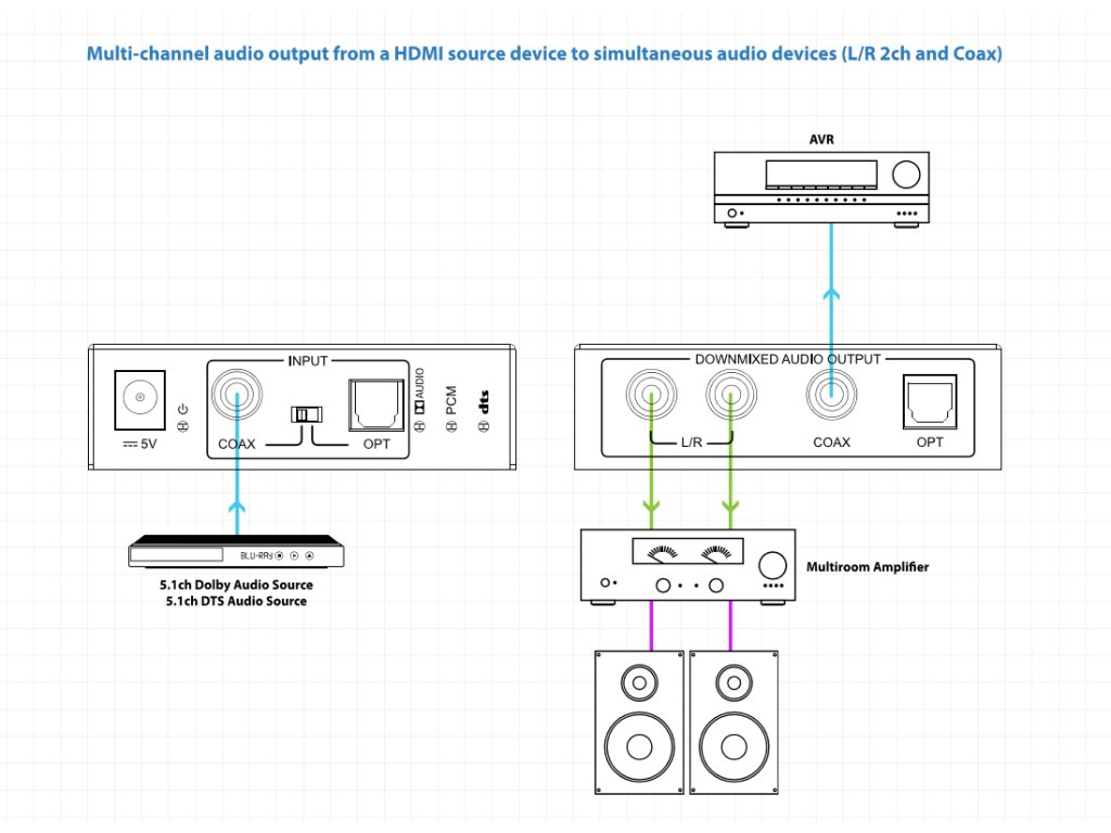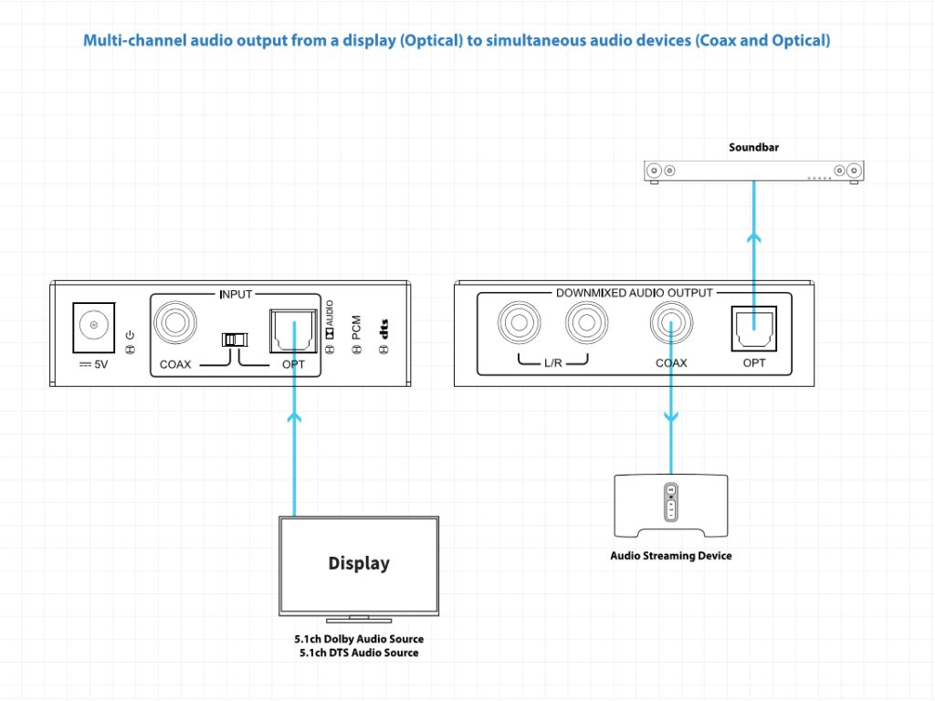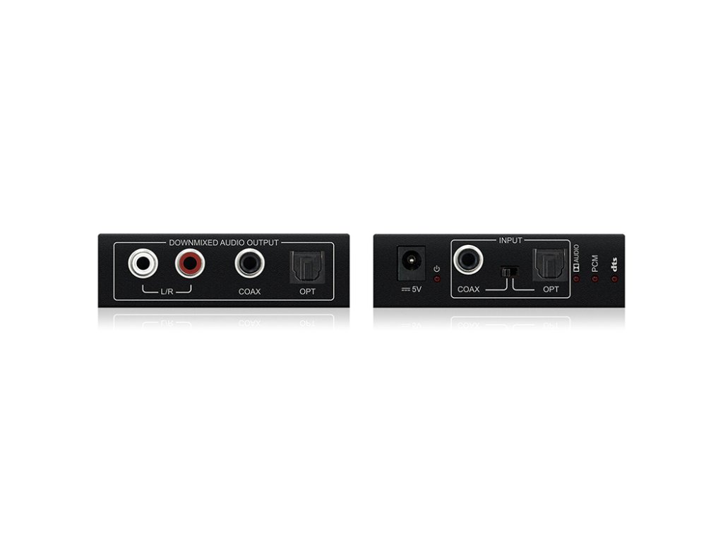 Blustream DAC13DB je DA převodník digitálního optického audio signálu Toslink nebo Coax PCM na 2 kanálový signál v analogovém stereo 2 x RCA/Cinch (DAC) a optiku (TOSLINK) nebo COAX audio výstupy. Podpora Dolby Digital a DTS audia. výrobce: Blustream, model: DAC13DB Downmixer 5.1ch Dolby Digital a DTS audia z optického nebo COAX digitálního zvuku z kompatibilních zařízení na 2 ch stereo zvuk. Současně hraje downmixovaný 2 kanálový zvuk přes analogové 2 x RCA, digitální COAX nebo optické audio výstupy. DAC13DB podporuje vzorkovací frekvenci až do 96 kHz a 24-bit. Podporované formáty Dolby Audio a DTS Audio: PCM 2 kanály Dolby Digital 2 kanály Dolby Digital 5.1ch DTS 2 kanály DTS 5.1chDoplňkové parametry