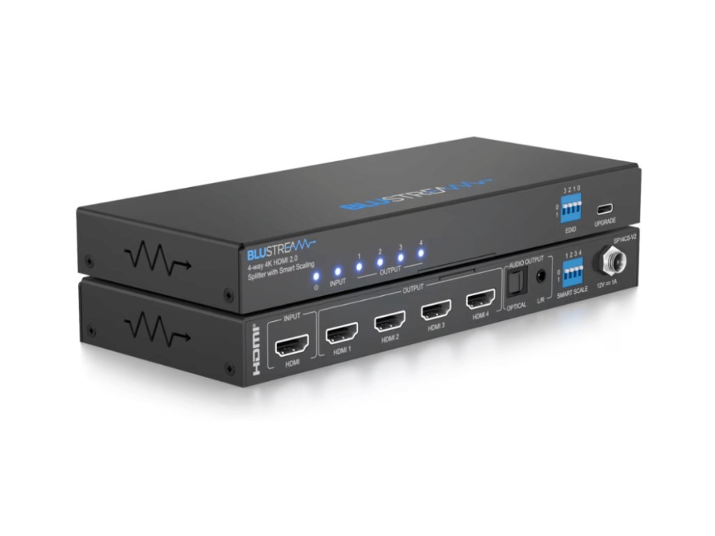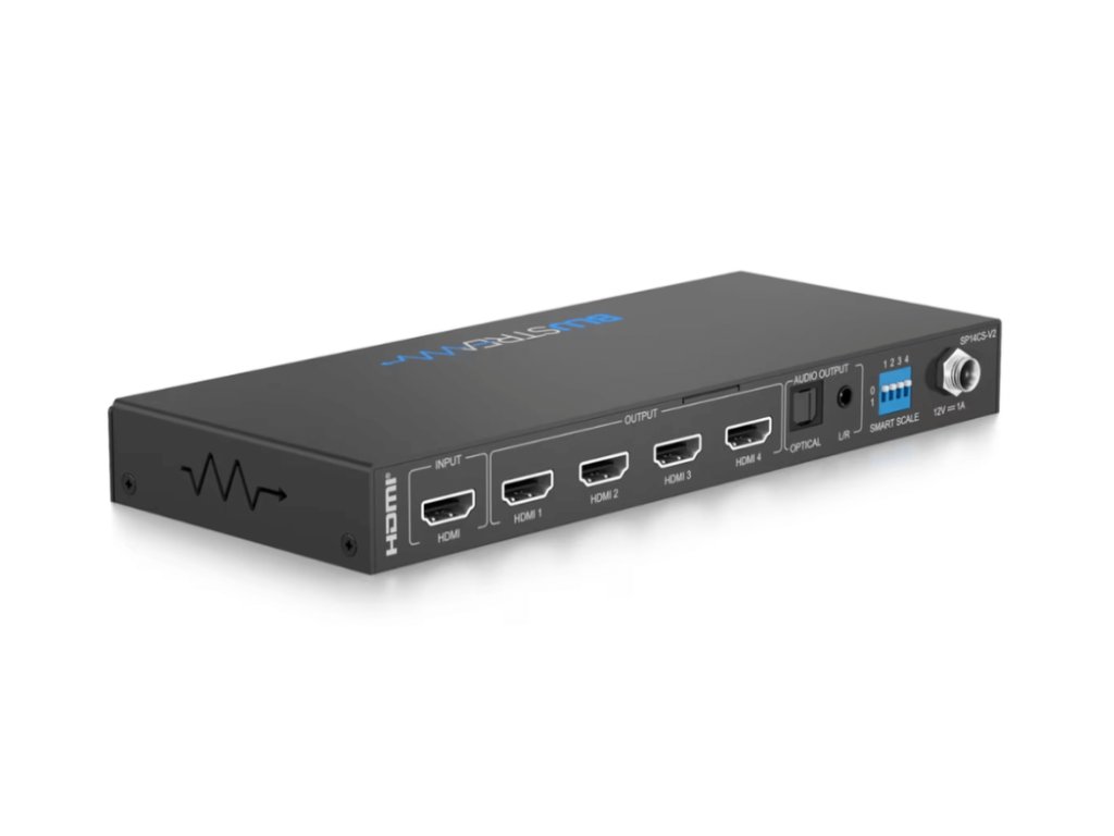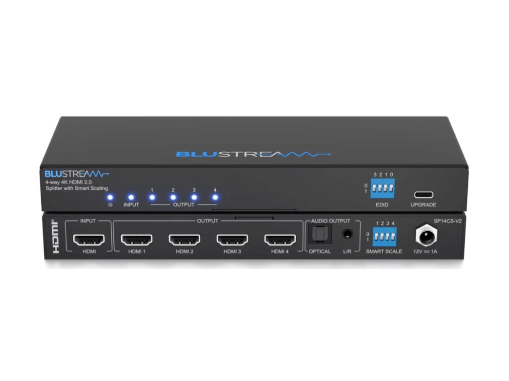 Blustream SP14CS-V2 4K HDMI 2.0 HDCP 2.2 rozbočovač s chytrým scalingem, audio breakoutem a EDID SP14CS-V2 4K HDMI 2.0 rozbočovač přenáší jeden HDMI zdroj do čtyř výstupů současně s digitálním (S/PDIF) a analogovým audio breakoutem. Rozbočovač podporuje plné HDMI 2.0 a HDCP 2.2 s rozlišením až 4K 60Hz 4:4:4 s automatickou konverzí obrazu na každém výstupu. Vlastnosti: 1x HDMI vstup, který je replikovaný do 4 HDMI výstupů Podporuje HDMI 2.0 18Gb/s včetně HDR Podpora až 4K UHD 60Hz 4:4:4 Konverze obrazu na výstupy umožňuje displeji, který je schopný přijímat pouze nižší rozlišení (4K 60Hz 4:2:0 nebo 1080p), přijímat obsah v rozlišení 4K 60Hz 4:4:4 a stále zobrazovat rozlišení 4K UHD na ostatních video výstupech Podporuje standardní video rozlišení včetně VGA-WUXGA a 480i-4K Podporuje všechny HDMI audio formáty včetně Dolby Atmos, Dolby TrueHD, Dolby Digital Plus a DTS-HD Master Audio HDMI audio breakout na analogové L/R audio a optické digitální výstupy současně CEC (Consumer Electronic Command) průchozí pouze mezi zdrojem a zařízením připojeným na výstupu 1 EDID management HDCP 2.2Doplňkové parametry