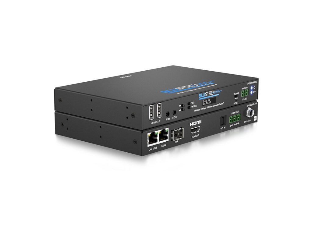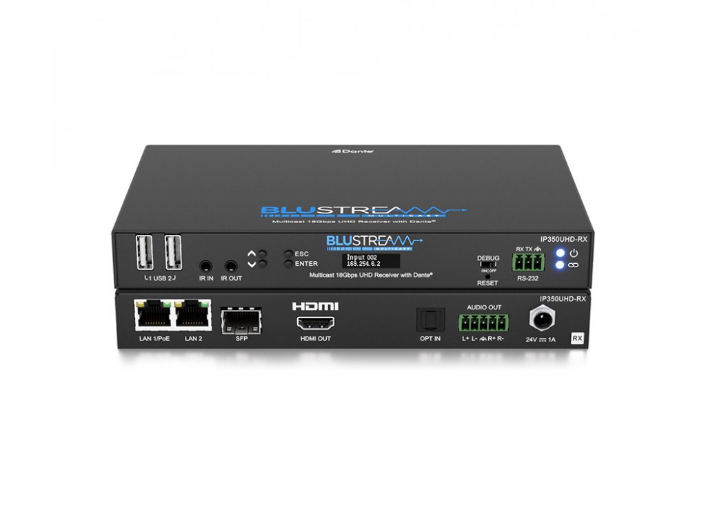 Blustream IP350UHD-RX IP Multicast HDMI 2.0 4K přijímač s podporou Dante Multicast distribuční platforma IP350 umožňuje virtuální distribuci 4K 18Gb/s HDMI videa bez latence přes 1Gb síť. Zařízení může být napájeno přes PoE ze síťového přepínače nebo lokálně pokud přepínač nepodporuje PoE. Díky plné interoperabilitě s produktovou řadou IP300UHD, je IP350UHD-RX špičkový Dante 4K HDCP 2.2 HDMI přijímač, který pomocí technologie vizuálně bezztrátové komprese přenáší 18Gb/s HDMI, Dante a AES67 audio, obousměrné IR, RS-232 a USB/KVM až do vzdálenosti 100 metrů přes standardní síťovou architekturu nebo do větší vzdálenosti pomocí zabudovaného optického SFP síťového rozhraní. Díky různým možnostem konfigurace je flexibilta multicast IP systému ideální pro různé typy instalací. IP350UHD-RX podporuje jak video tak i Dante audio distribuci z jedné sítě. Druhé RJ45 připojení umožňuje oddělené Dante audio síťového rozhraní od videa přes IP. Vlastnosti: 4K HDMI 2.0 video přes 1Gb síť s podporou 18Gb/s HDMI signálu Prakticky neomezená velikost systému Přenáší HDMI do vzdálenosti až 100 m přes jeden CAT kabel SFP port pro distribuci signálu Podporuje rozlišení až 4K UHD 60Hz 4:4:4 Podporuje HDR včetně Dolby Vision LLM Podporuje všechny známé HDMI audio formáty včetně Dolby Atmos, Dolby TrueHD, Dolby Digital Plus a DTS-HD Master Audio Pokročilá správa signálu pro nezávislé směrování IR, RS-232, USB/KVM, audia a videa PoE (Power over Ethernet) pro napájení Blustream zařízení z PoE přepínače Duální RJ45 síťové porty konfigurovatelné pro nezávislou nebo kombinovanou HDMI a Dante distribuci signálu SFP port pro nezávislou nebo kombinovanou HDMI a Dante distribuci signálu přes jeden optický kabel HDCP 2.2 Analogový L/R audio výstup, který podporuje jak symetrické tak i nesymetrické audio signály Optický (S/PDIF) vstup pro dvoukanálový optický zpětný kanál, který může být nasměrován do sítě Dante OLED displej na předním panelu pro informace o systému a manuální konfiguraci Možnost 24V napájecího zdroje (pokud Ethernetový přepínač nepodporuje PoE) Kompatibilní s Blustream IP350UHD-TX a IP300UHD-TX/RX produkty Systém IP300/350 Multicast nabízí 4 provozní režimy: - Maticová distribuce (vyžaduje 1Gb síťový přepínač) - Video wall (vyžaduje 1Gb síťový přepínač) - 1 na 1 HDMI extender (síťový přepínač není potřeba) - 1 na x (několik) HDMI extender (síťový přepínač není potřeba)Doplňkové parametry