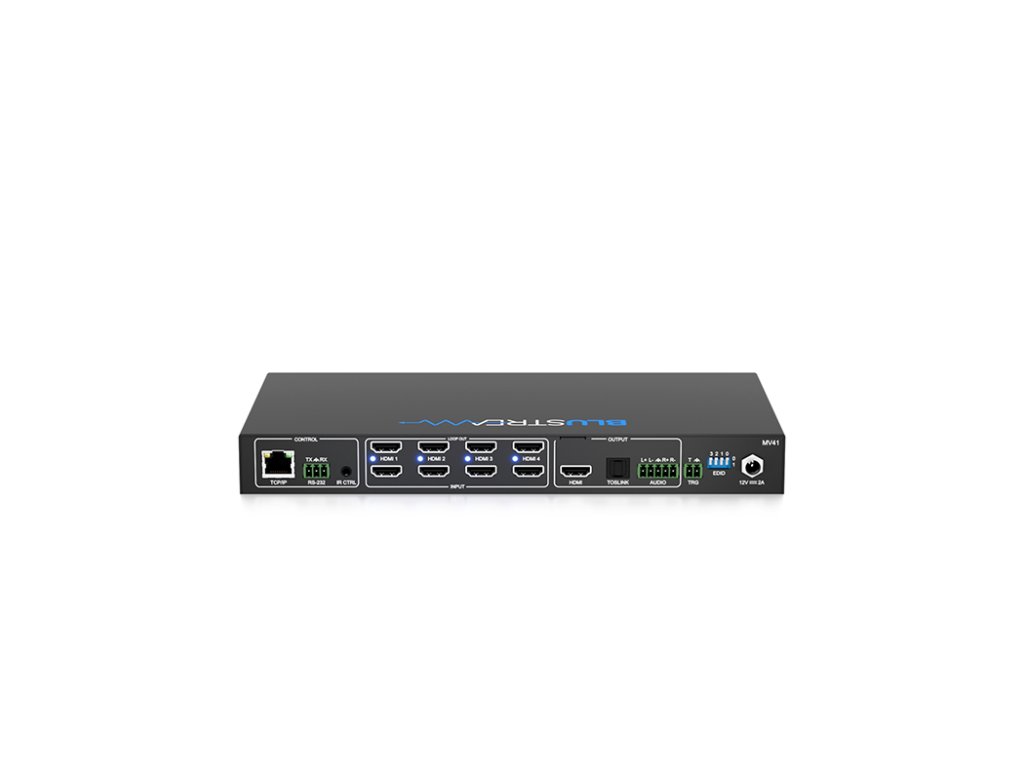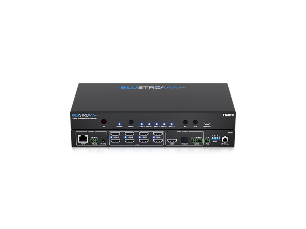 Blustream MV41 4x1 HDMI přepínač s funkcí Multi-view Blustream MV41 je pokročilý 4x1 HDMI přepínač s funkcí Multi-view. Umožňuje zobrazení až 4 HDMI2.0 zdrojů na jednom displeji současně, s předdefinovanými a přizpůsobitelnými konfiguracemi videa a plynulým přepínáním. Přepínač podporuje HDMI loop-through pro všechny HDMI vstupy, což umožňuje kaskádování původních signálů zdroje pro další distribuci. MV41 obsahuje 2kanálový PCM a optický S/PDIF audio breakout, s možností řízení přes webové rozhraní, TCP/IP, RS-232, IR dálkové ovládání nebo pomocí tlačítek na předním panelu. Díky různým konfiguračním a konektivním možnostem je MV41 vhodný pro domácí i komerční instalace. Vlastnosti Pokročilý 4vstupový HDMI přepínač s HDMI výstupem Multi-view 4x HDMI loop out pro integraci místních displejů nebo kaskádování na více zařízení Podpora PIP, PBP, POP a zobrazovacích režimů (Dual, Triple, Quad) s předdefinovanými a přizpůsobitelnými konfiguracemi Podpora video down-scalingu a konverze HDR na SDR na HDMI Multi-view výstupu Podpora HDMI2.0 4K UHD 60Hz 4:4:4 18 Gb/s včetně HDR Podpora všech standardních video rozlišení včetně VGA-WUXGA a 480i-4K Podpora všech známých formátů HDMI audia včetně Dolby Atmos, Dolby TrueHD, Dolby Digital Plus a DTS-HD Master Audio HDMI audio breakout na analogový L/R zvuk a optické digitální výstupy současně Analogové výstupy L/R zvuku podporují symetrické i nesymetrické zvukové signály Ovládání pomocí předního panelu, IR, RS-232, TCP/IP, webového rozhraní a 12V triggeru Dodáváno s Blustream 5V IR přijímačem a dálkovým ovládáním Dostupné ovladače třetích stran Kompatibilní s HDCP2.3 s pokročilým řízením EDIDDoplňkové parametry