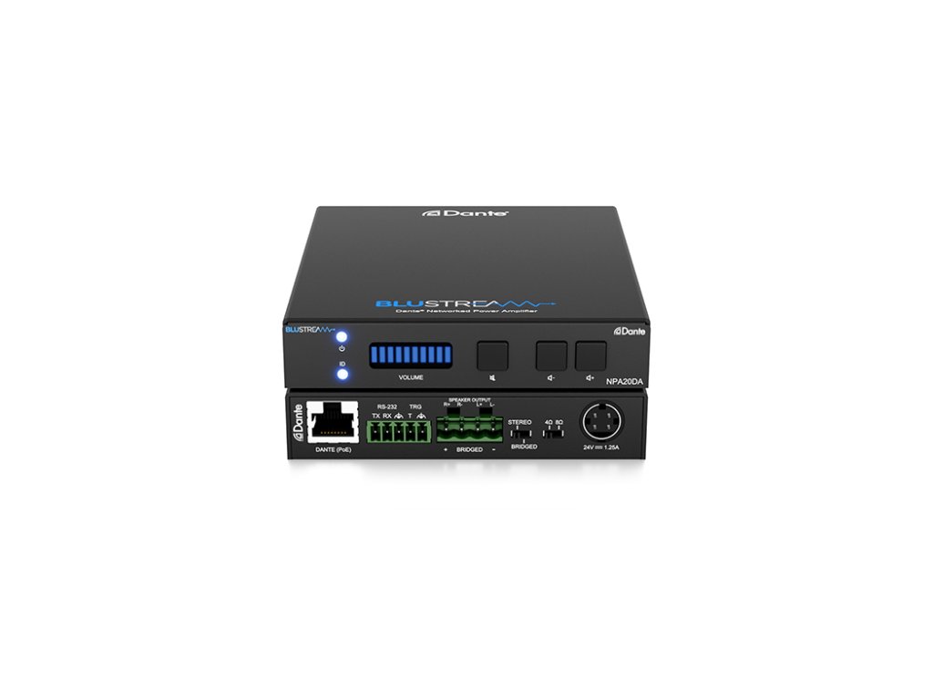 Blustream NPA20DA síťový zónový audio zesilovač s dante Tento síťový zesilovač NPA20DA poskytuje pokročilou integraci zvuku v komerční nebo rezidenční AV instalaci. NPA20DA je vybaven 2 x 10W digitálním (1 x 20 W mono) audio výstupem a integrací zvuku Dante®. NPA20DA lze napájet přes PoE nebo PoE+ z kompatibilního síťového switche nebo lokálně, pokud přepínač nepodporuje PoE. Zařízení má také schopnost snížit výstupní výkon zesilovače v závislosti na možnostech PoE, DSP s 31pásmovým EQ, zpoždění zvuku pro korekci lip sync a ovládání přes přední panel, RS-232, TCP/IP, web-GUI nebo 12V trigger. Vlastnosti: Pokročilý síťový audio zesilovač s integrací Dante® Podporuje 2 x 10 W 4 / 8 ohmů, 1 x 20 W 4 / 8 ohmů Podporuje napájení přes PoE+ na Dante® LAN připojení nebo přes napájecí zdroj* 2 kanálový audio vstup Dante® / AES67 DSP s 31 pásmovým EQ s +3dB/-10dB a zpožděním zvuku Trigger vstup 0V / 5~12V Ovládání přes přední panel, RS-232 a IP Automatický pohotovostní režim se snímáním signáluDoplňkové parametry