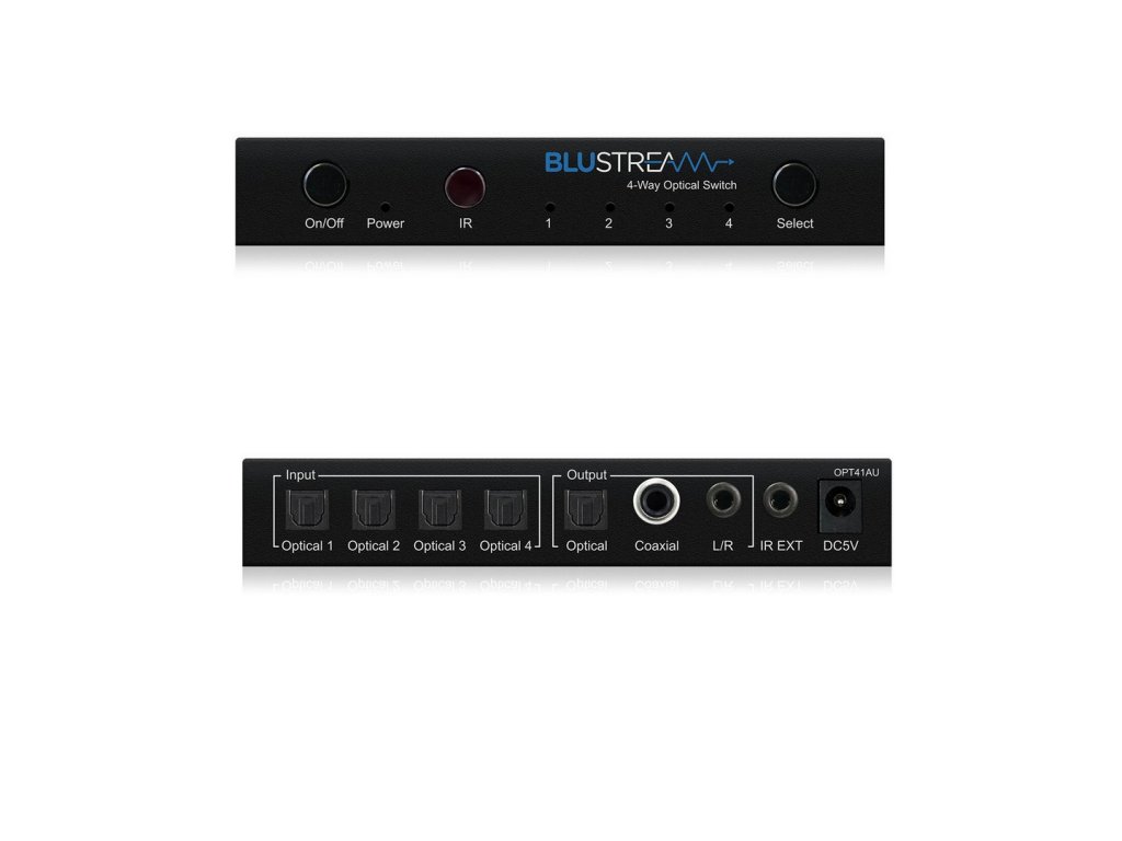 Blustream OPT41AU je přepínač optických audio vstupů se zabudovaným DAC, vstupy: 4x optický (Toslink), výstupy: 1x optický (Toslink), 1x RCA (SPDIF), 1x analogové audio L/R Blustream OPT41AU je přepínač optického zvuku nabízející čtyři optické vstupy. Je ideální pro integraci vícero zdrojů zvuku se soundbarem. OPT41AU nabízí také zabudovaný DAC a simultánní digitální a analogové stereo audio výstupy. OPT41AU podporuje 192 kHz vzorkovací frekvenci a rozlišení až 24-bit. Vlastnosti: 4x optické Toslink digitální vstupy, které lze přenést na 1x optický výstup (Toslink) DAC převede vybraný optický digitální signál na analogový L/R stereo audio výstup Zabudovaný převodník digitálního audia převede optický audio vstup na koaxiální digitální výstup Souběžné výstupy: optický digitální, koaxiální digitální a analogové L/R stereo audio Podporuje vzorkovací frekvence 32kHz, 44.1kHz, 48kHz, 96kHz & 192kHz a rozlišení až 24-bit Podporuje LPCM, DTS, Dolby Digital a Dolby Digital plus při přímém použití digitálního vstupu a výstupu přepínače Ultra low jitter a high fidelity design Na předním panelu je tlačítko pro výběr vstupu a přepínání mezi optickými vstupy IR přijímač na předním panelu umožní přepínání vstupů a zapnutí/vypnutí audio výstupů pomocí dálkového IR ovládání Externí IR vstup slouží k rozšíření dosahu IR (při použití IR kabelu přijímače)Doplňkové parametry
