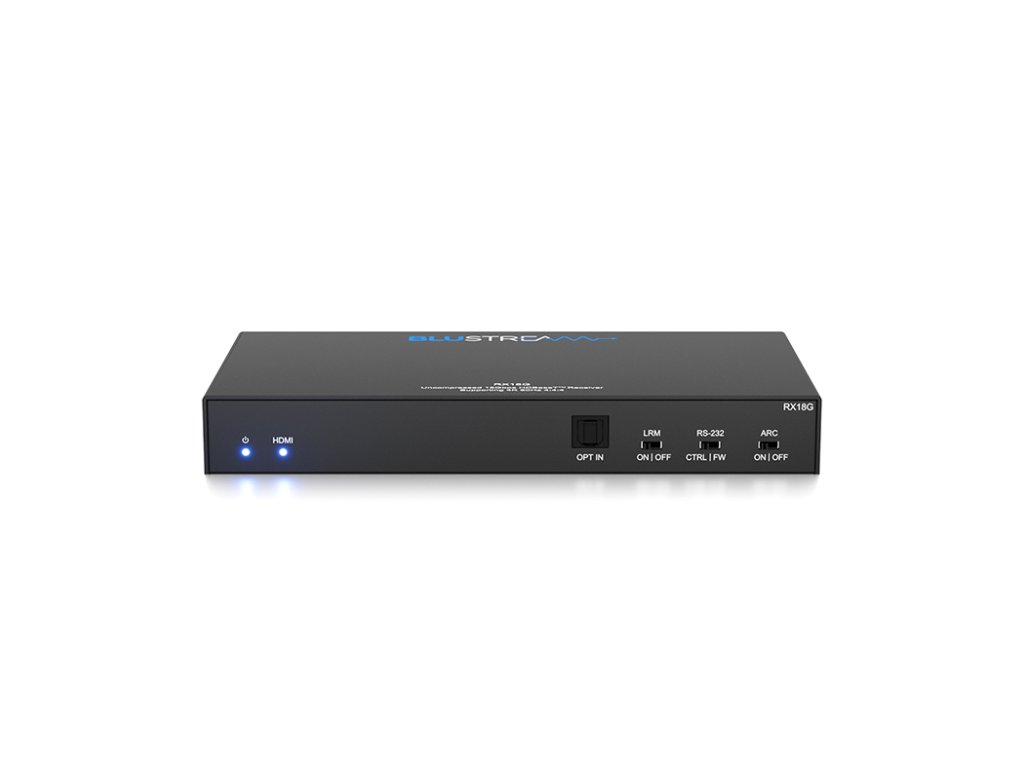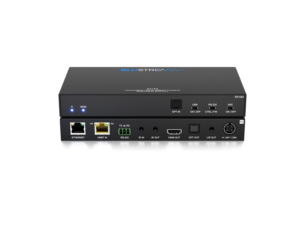 Blustream RX18G 18Gb/s HDBaseT3™ přijímač pro přenos nekomprimovaného obsahu Přijímač RX18G je špičkové nekomprimované, nekonvertované HDMI 2.0 4K 60Hz 4:4:4 HDCP 2.3/2.2 řešení využívající nejnovější technologii HDBaseT3™. RX18G podporuje nekomprimovanou distribuci nejnovějších rozlišení HDR včetně HDR10/10+ a Dolby Vision, což vede k maximální kvalitě obrazu. RX18G podporuje obousměrné IR, RS-232 a PoC až do vzdálenosti 100 m přes jeden kabel CAT6A a zároveň poskytuje funkce jako je ARC přes HDMI nebo optiku (S/PDIF) a 1Gb Ethernet. Vlastnosti: • Pokročilá technologie HDBaseT3™ nabízející distribuci videa a zvuku přes jeden CAT6A kabel• Podporuje nekomprimovaný přenos signálu HDMI 2.0 18Gb/s 4K 60Hz 4:4:4 včetně HDR• Přenáší HDMI 1080p video signály až do vzdálenosti 150 m (HDBaseT™ režim dlouhého dosahu)• Podporuje všechna standardní rozlišení videa včetně VGA-WUXGA a 480i-4K• Podporuje ARC (Audio Return Channel) z připojeného displeje přes HDMI nebo optické digitální vstupy (při použití s kompatibilní maticí Blustream)• Obousměrný 1Gb Ethernet při použití s kompatibilním maticovým řešením Blustream• Podporuje všechny známé zvukové formáty HDMI včetně přenosu Dolby Atmos, Dolby TrueHD, Dolby Digital Plus a DTS-HD Master Audio• Obousměrné RS-232 • Podporuje obousměrný IR průchod z kompatibilní matice Blustream• Podporuje PoC (Power over Cable) z kompatibilní matice Blustream• HDCP 2.3• Doporučený přijímač pro použití s Blustream maticí HMX88-18G a HMX44-18G *Přenosová vzdálenost závisí na formátu videa, typu kabelu a prostředí instalace. Doporučuje se použít alespoň CAT6A kabeláž.Doplňkové parametry