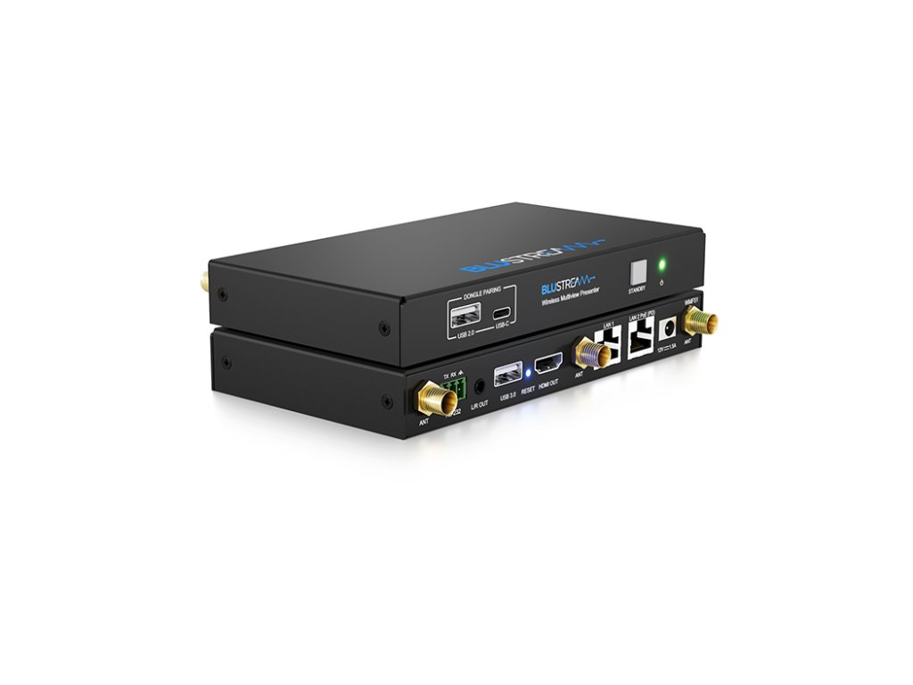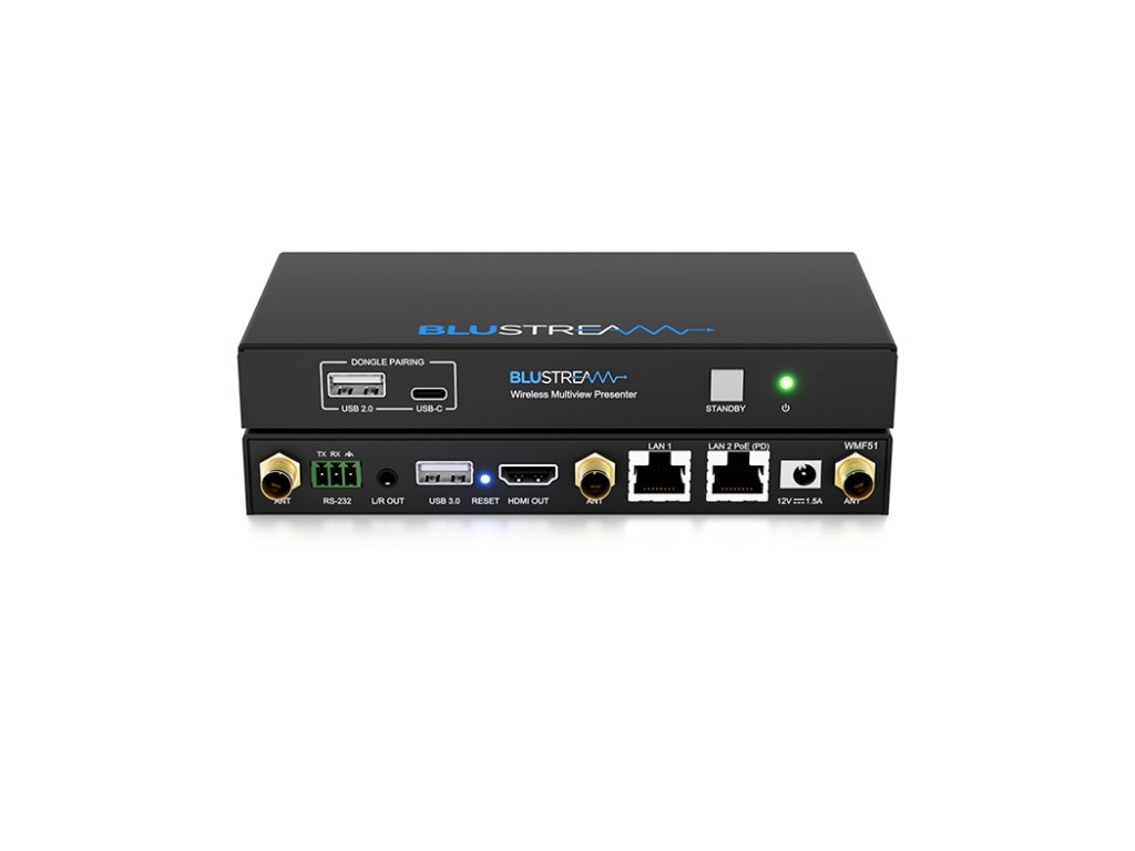 Blustream WMF51 bezdrátový multipřepínač WMF51 je 4K multiformátový prezentační přepínač se vstupy AirPlay, Miracast® a Chromecast® do výstupu HDMI. WMF51 poskytuje vylepšené funkce včetně prezentace s více náhledy, video scaling, webového GUI pro ovládání a konfiguraci, lokalizovaného 2,4/5G WiFi hotspotu a duální LAN konektivity. WMF51 také nabízí ovládání OSD, USB touch-back k připojenému hostitelskému zařízení, tabuli a překrytí obrazovky s manuálním nebo automatickým výběrem zdroje. WMF51 lze ovládat přes přední panel, RS-232 nebo TCP/IP.Kompatibilní s Blustream WMF-USBC a WMF-HDMI plug and play bezdrátovými dongly, což poskytuje ideální řešení BYOD pro vaši zasedací místnost, učebnu nebo huddle-space. Vlastnosti: 4K multiformátový multi-view přepínač Podpora bezdrátového AirPlay, Miracast®, Chromecast® a Blustream dongle, které lze přepínat na výstup HDMI Multiview prezentace s až 4 souběžnými video signály s konfigurovatelným rozložením obrazovky Video scaler s výstupem až 4K 60Hz 4:4:4 Lokalizovaný 2,4G/5G WiFi hotspot pro AirPlay, Miracast® a Chromecast® point-to-point režimu (až 1080p) Duální LAN připojení pro integraci do stávající síťové infrastruktury Podporuje funkci USB 3.0 touch-back prostřednictvím dongle WMF-USBC / WMF-HDMI a Miracast®* Audio breakout na analogový zvuk L/R Modul webového rozhraní pro ovládání a konfiguraci zařízení Ovládání OSD s funkcí náhledu Funkce tabule a překrytí obrazovky Ovládání přes přední panel, RS-232 a TCP/IP s ručním nebo automatickým výběrem zdroje Obsahuje PoE třídy 0 IEEE 802.3af pro napájení z PoE switche *Kompatibilita s Miracast závisí na daném systému Windows. Připojení USB 3.0 je určeno pro připojení k interaktivnímu displeji pouze pro funkce touch-back a neposkytuje celkové možnosti USB 3.0 pro použití se zařízeními VC / UC.Doplňkové parametry