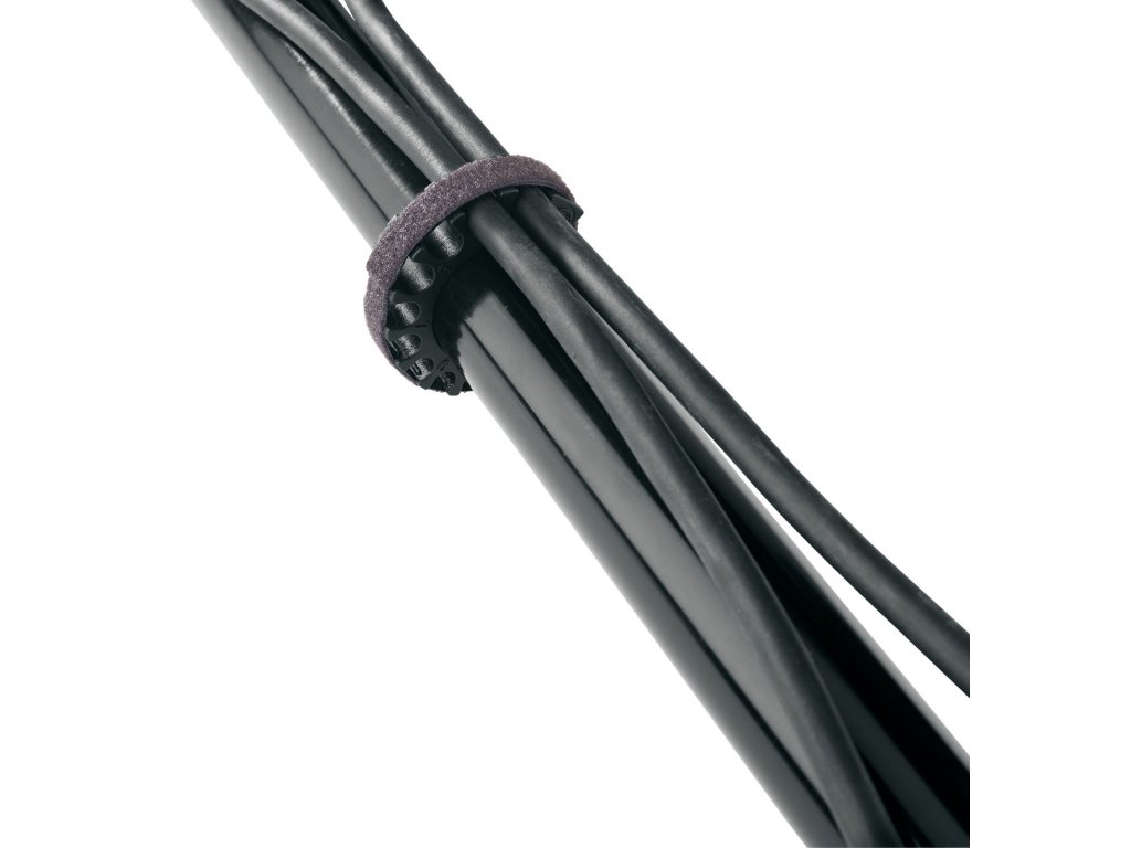 Kabelová svorka pro uchycení 12-ti kabelů šířky 4-9 mm. Umístění kabelů do drážky a zajištění pomocí pásky na suchý zip. Svorku je možné připevnit k reproduktorovému stojanu nebo stojanu na světla s průměrem 35 - 42 mm. Balení obsahuje 2 svorky. Vyrábí se v černé barvě.