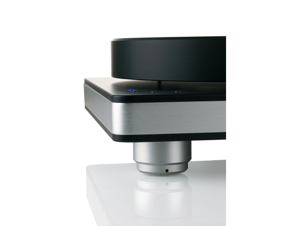 O další izolaci od nežádoucích vibrací přicházejících z vnějšího prostředí se starají masivní kovové nožky. Ty jsou skládané z několika vrstev a díky jemnému závitu umožňují gramofon zcela přesně vyvážit na jakémkoliv povrchu.