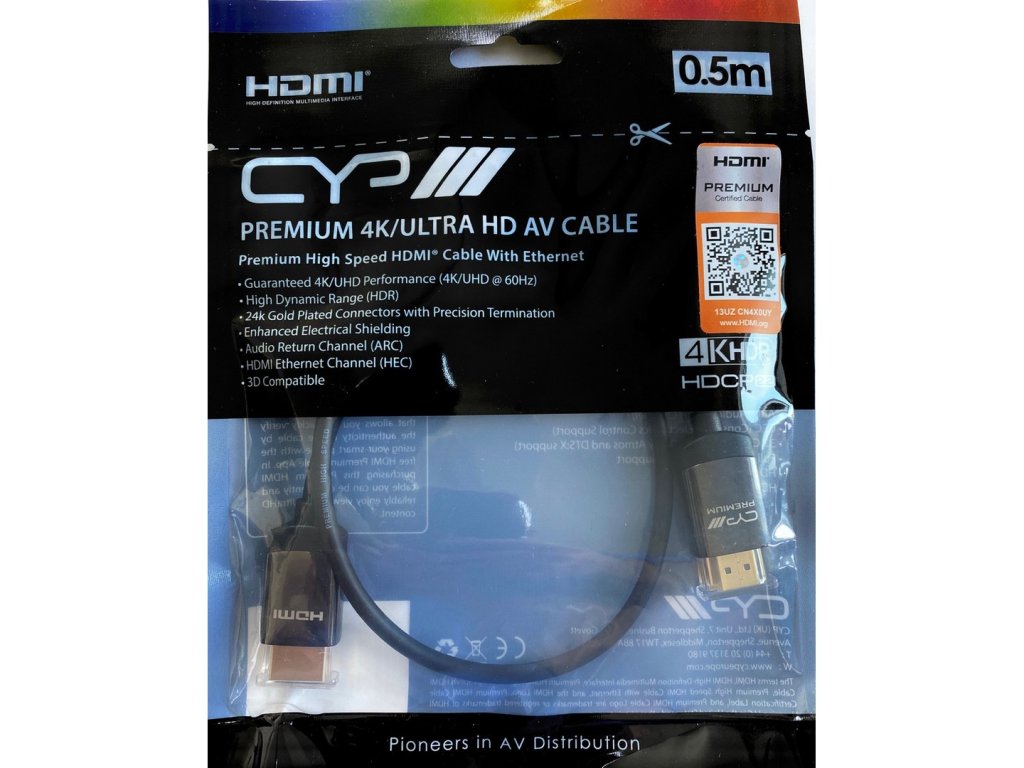 CYP HDMP Certifikovaný Premium HDMI 4K UHD kabel HDMP – High Speed 18Gb/s + Ethernet HDMI kabel (4K, UHD), 3D, ARC Akční cena platí pouze do vyprodání aktuálních skladových zásob! Certifikovaný kabel HDMI Premium CYP je kompatibilní s celou řadou specifikací HDMI, včetně 4K UHD (2160p), FULL HD (1080p) rozlišení, HDR, 3D, Ethernet (HEC) a ARC (audio zpětný kanál). Nabízející dokonalý výkon v oblasti přenosu zvuku, tento nový certifikovaný Premium HDMI kabel obsahuje izolované kovové konektory a stíněný kabel. Značka proti padělání, která je uvedena na obalu kabelu CYP Premium HDMI, má zašifrované údaje v podobě QR kódu, které vám umožní rychle ověřit autentičnost kabelu pomocí svého chytrého telefonu pomocí aplikace HDMI Premium Cable, která je volně ke stažení. Dostupný v různých délkách. Vlastnosti: Podpora rozlišení 4K / UHD (2160p 60Hz 4: 4: 4) Vysokorychlostní (18Gb/s) Vysoká snímková frekvence (600 MHz) BT.2020 kolorimetrie (10/12 bit / 4: 4: 4) Podporuje Ethernet a audio zpětný kanál (ARC) Podpora CEC (Consumer Electronic Control) Podpora zvuku 32 kanálů (Dolby Atmos a DTS: X) Kompatibilní s 3D Kompatibilní s HDCP2.2 Rozměry konektoru: 160 mm x 10 mm x 200 mm Délky: 0.5m, 1m, 2m, 3m, 5m, 6mDoplňkové parametry