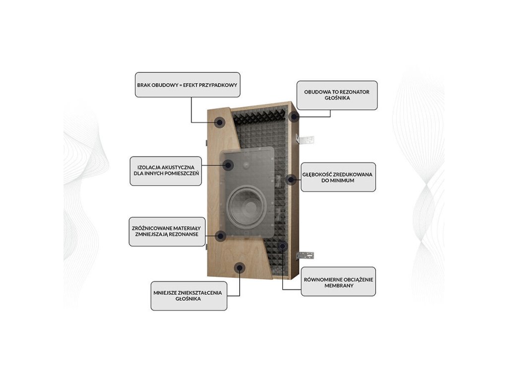 - Použití zapuštěné skříně pro reproduktory CI umožňuje dosáhnout nejlepších zvukových efektů, zejména v oblasti nízkých středů a čistých basů. Klíčovým prvkem dobrého zvuku je zajištění vhodně velké a tlumené skříně. Skříně vytvářejí pro reproduktor rezonátor. Vysoce kvalitní materiály zajišťují vynikající odezvu.
